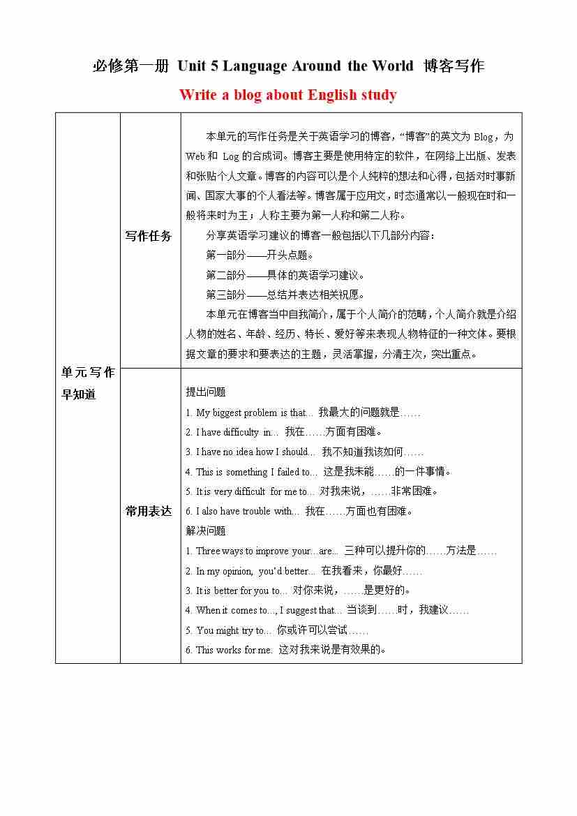 Unit 5 Language Around the World 博客写作(单元同步写作讲义)英语人教版2019必修第一册(教师版)