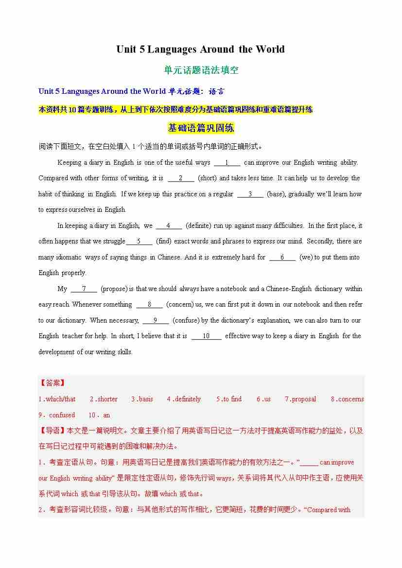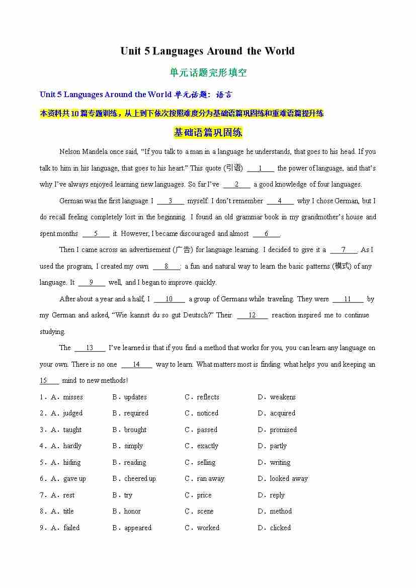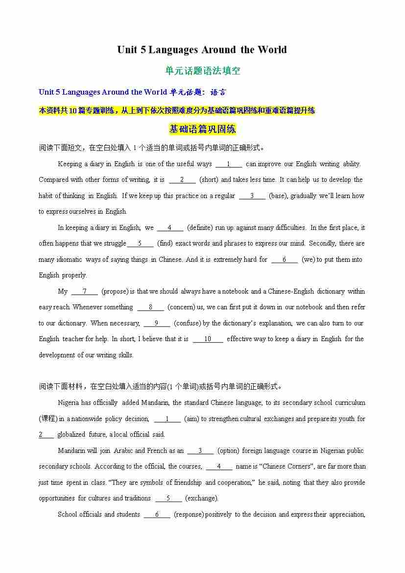 Unit 5 Languages Around the World单元话题语法填空练习(学生版)