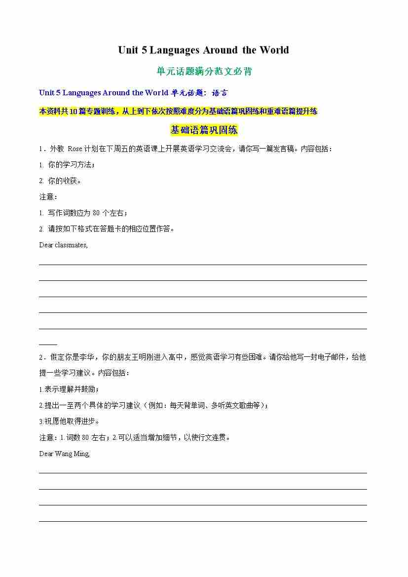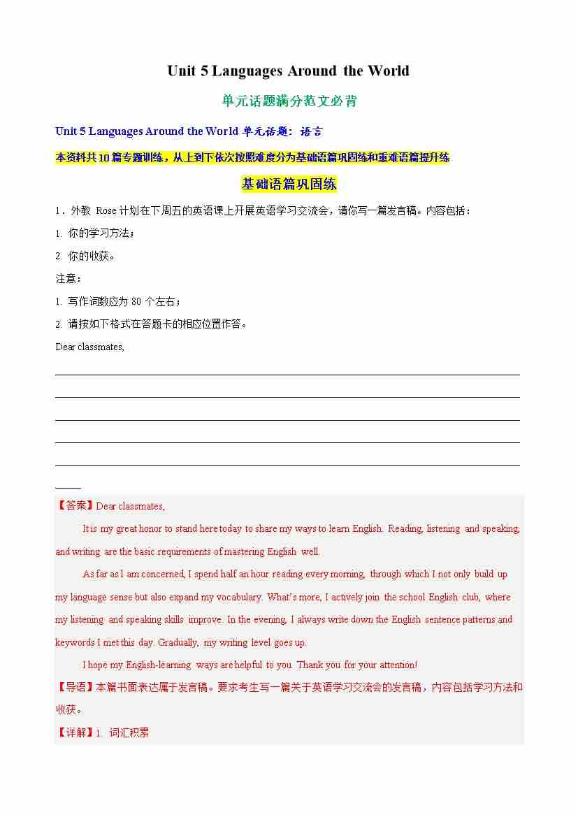 Unit 5 Languages Around the World单元话题满分范文必背(教师版)