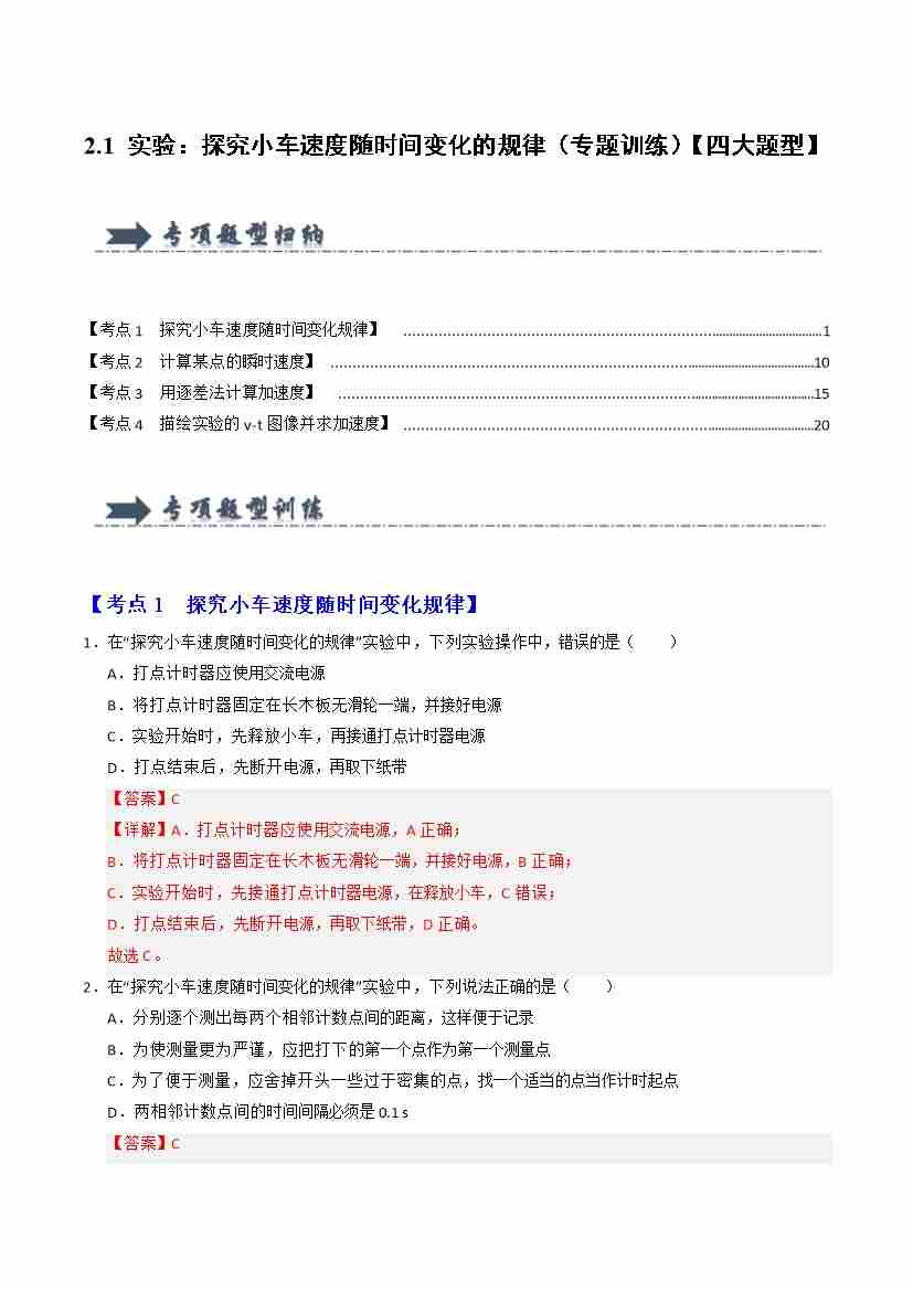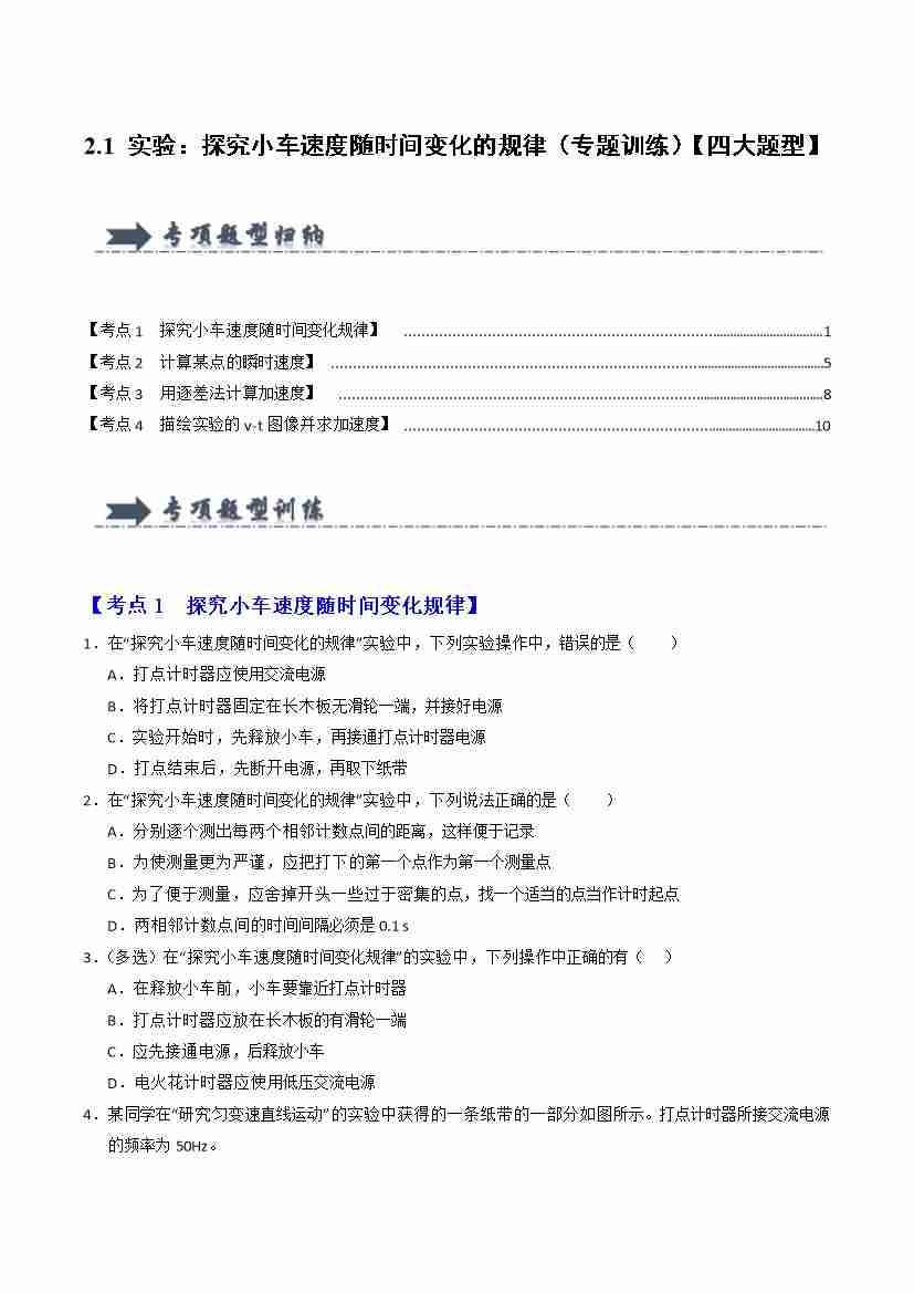 2.1 实验:探究小车速度随时间变化的规律(专题训练)(四大题型)(教师版)