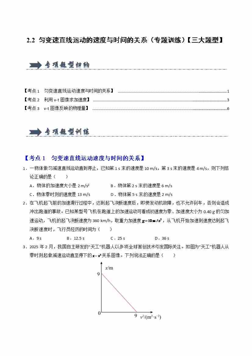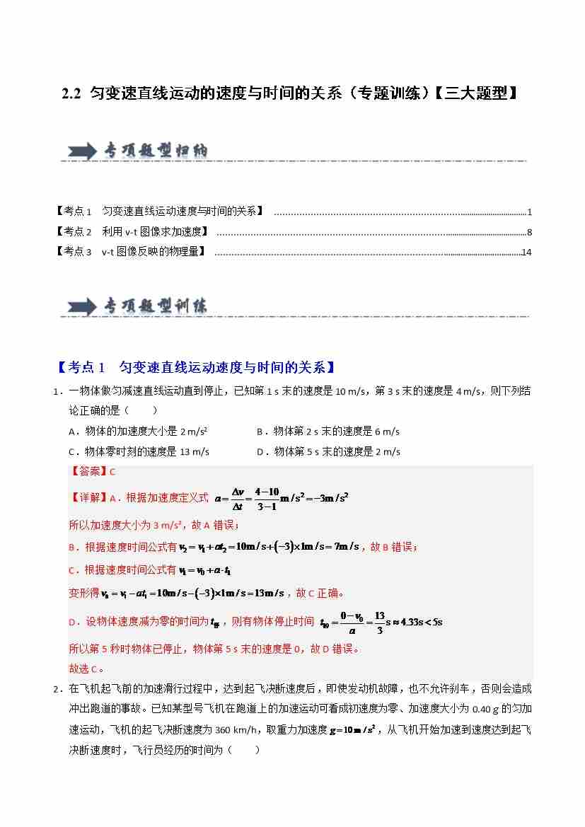 2.2 匀变速直线运动的速度与时间的关系(专题训练)(三大题型)(学生版)
