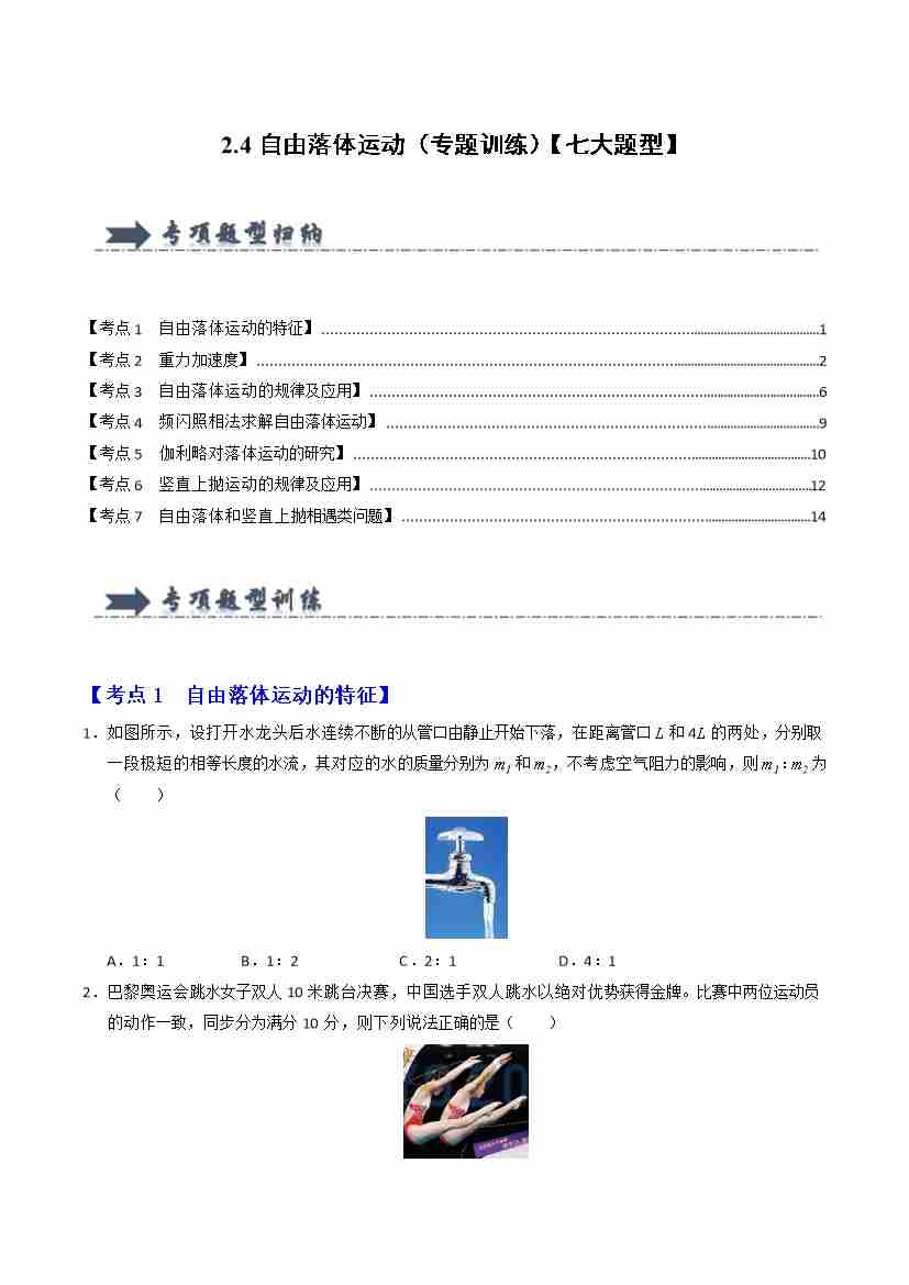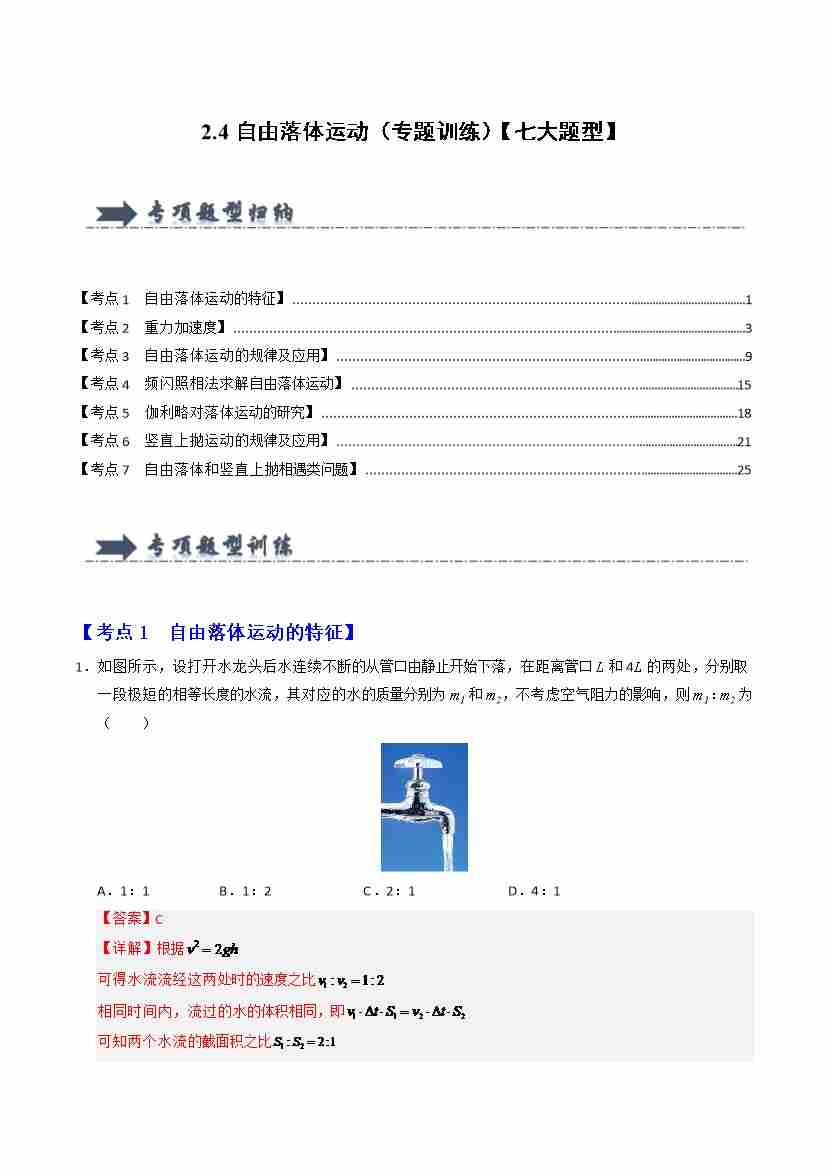 2.4自由落体运动(专题训练)(七大题型)(学生版)