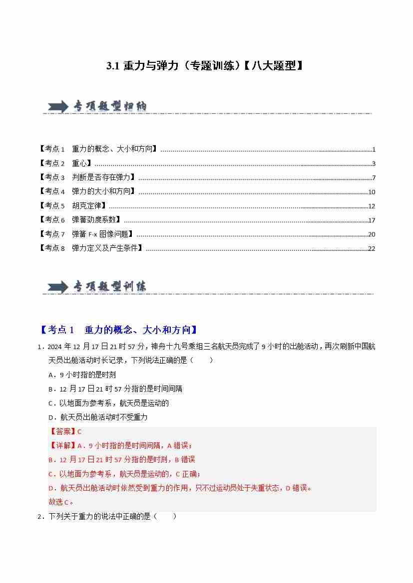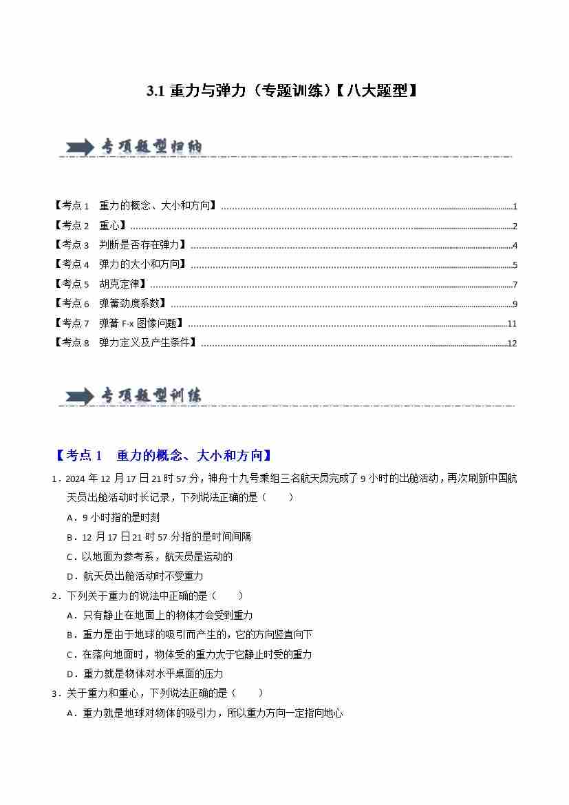 3.1重力与弹力(专题训练)(八大题型)(学生版)
