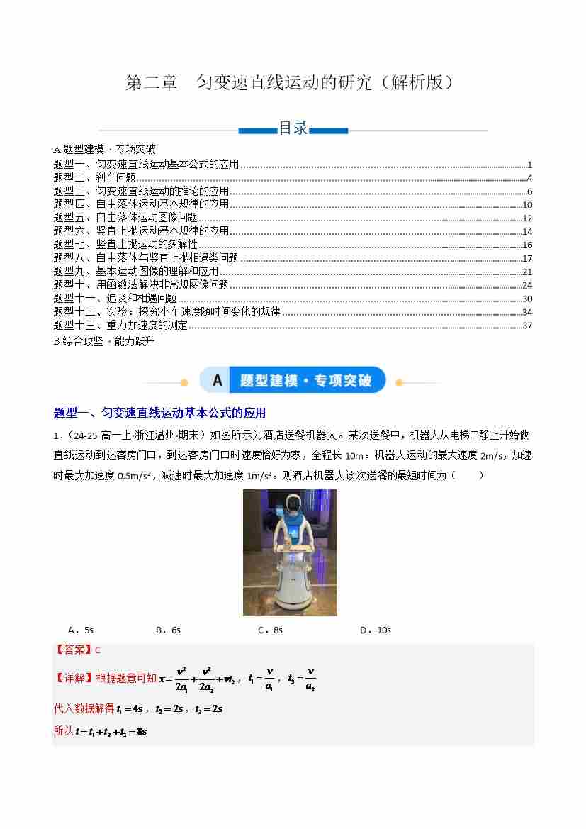第二章 匀变速直线运动的研究(专项训练)(教师版)