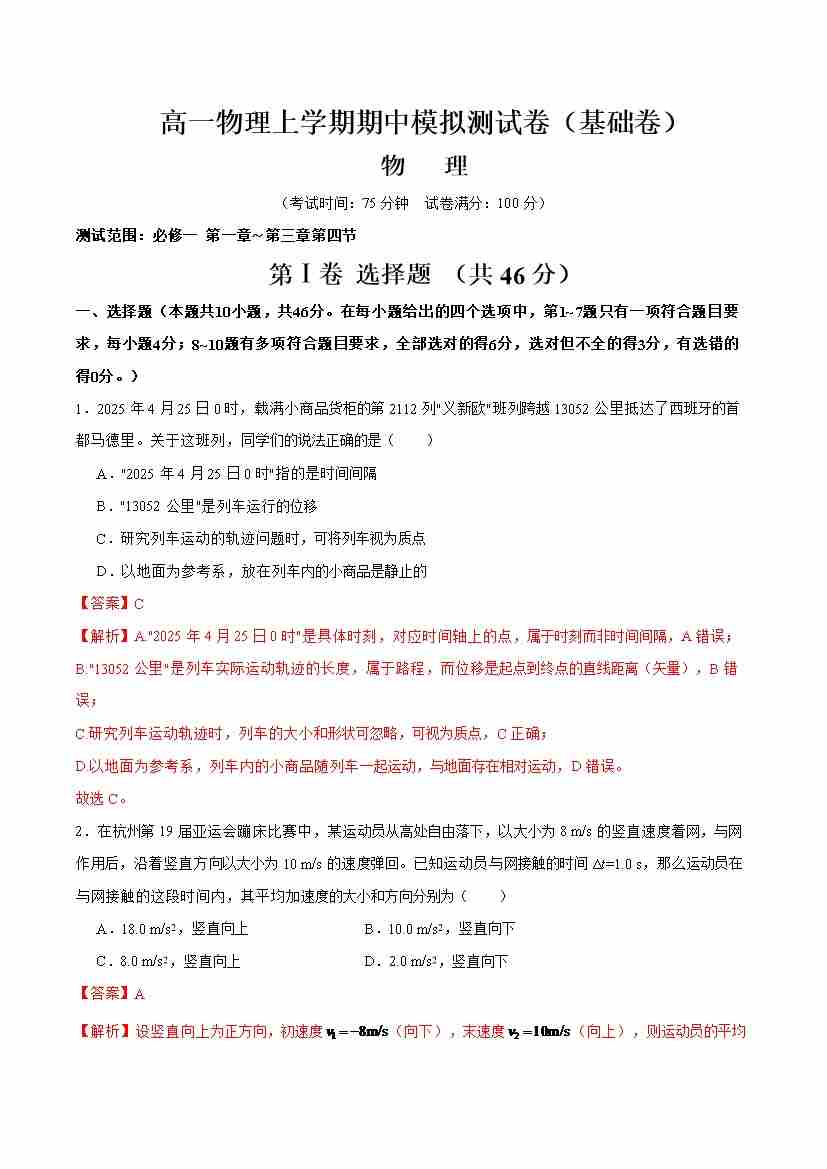 高一物理上学期期中模拟测试卷(基础卷)(教师版)