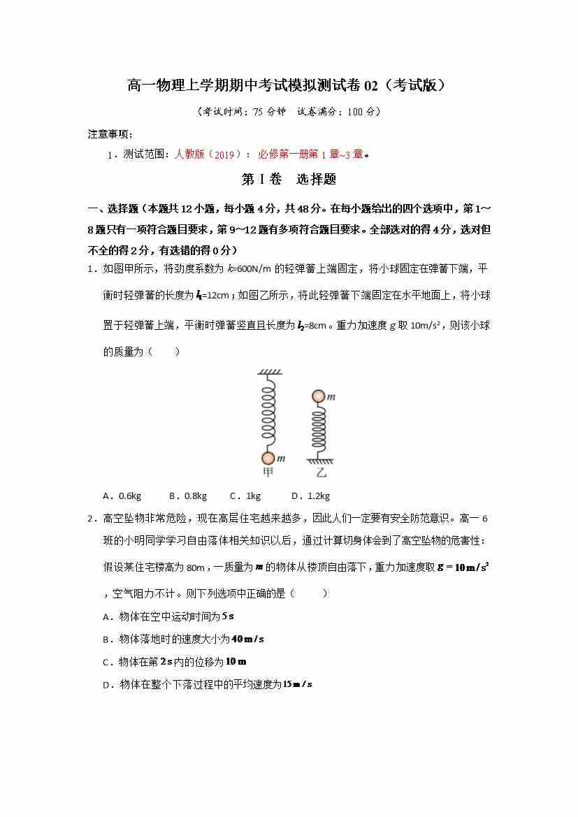 高一物理上学期期中考试模拟测试卷02(测试范围:人教版2019必修第一册,第1~3章)(考试版)