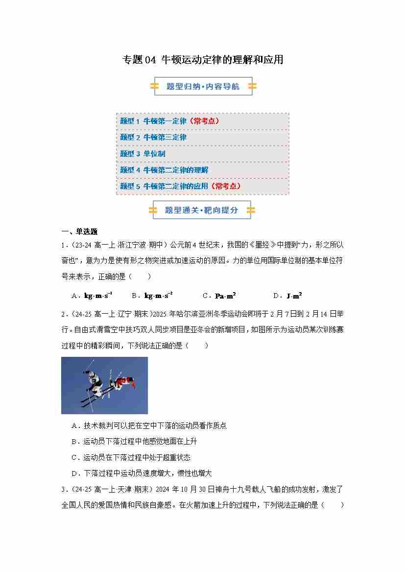 专题04 牛顿运动定律的理解和应用(期末专项训练)(原卷版)