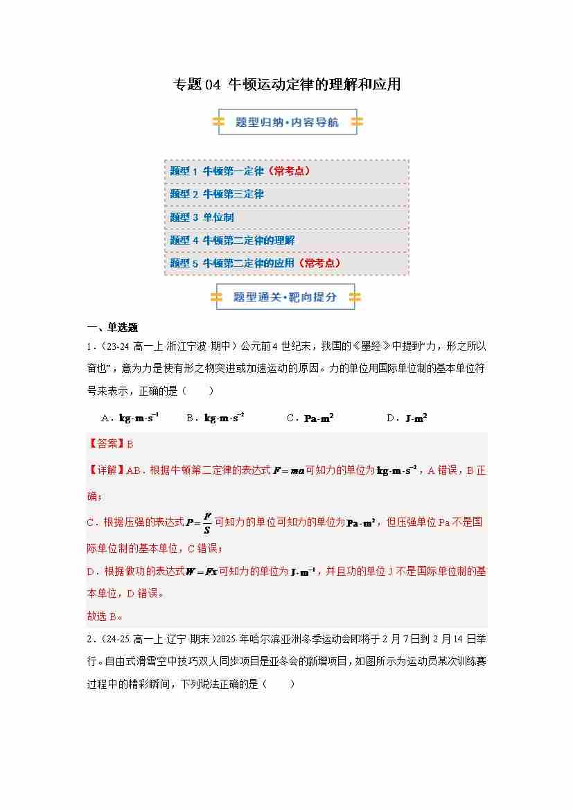 专题04 牛顿运动定律的理解和应用(期末专项训练)(解析版)