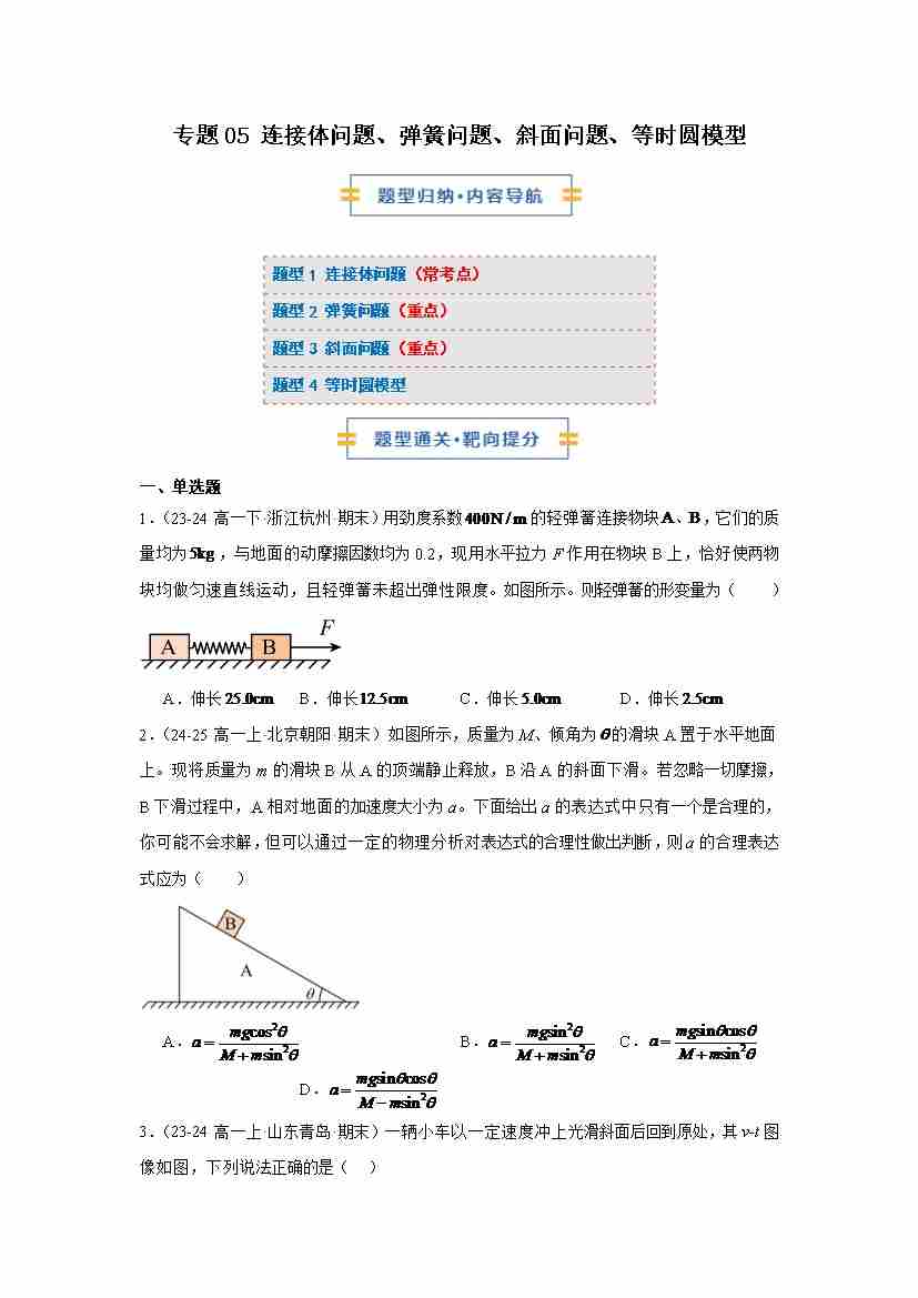 专题05 连接体问题、弹簧问题、斜面问题、等时圆模型(期末专项训练)(原卷版)