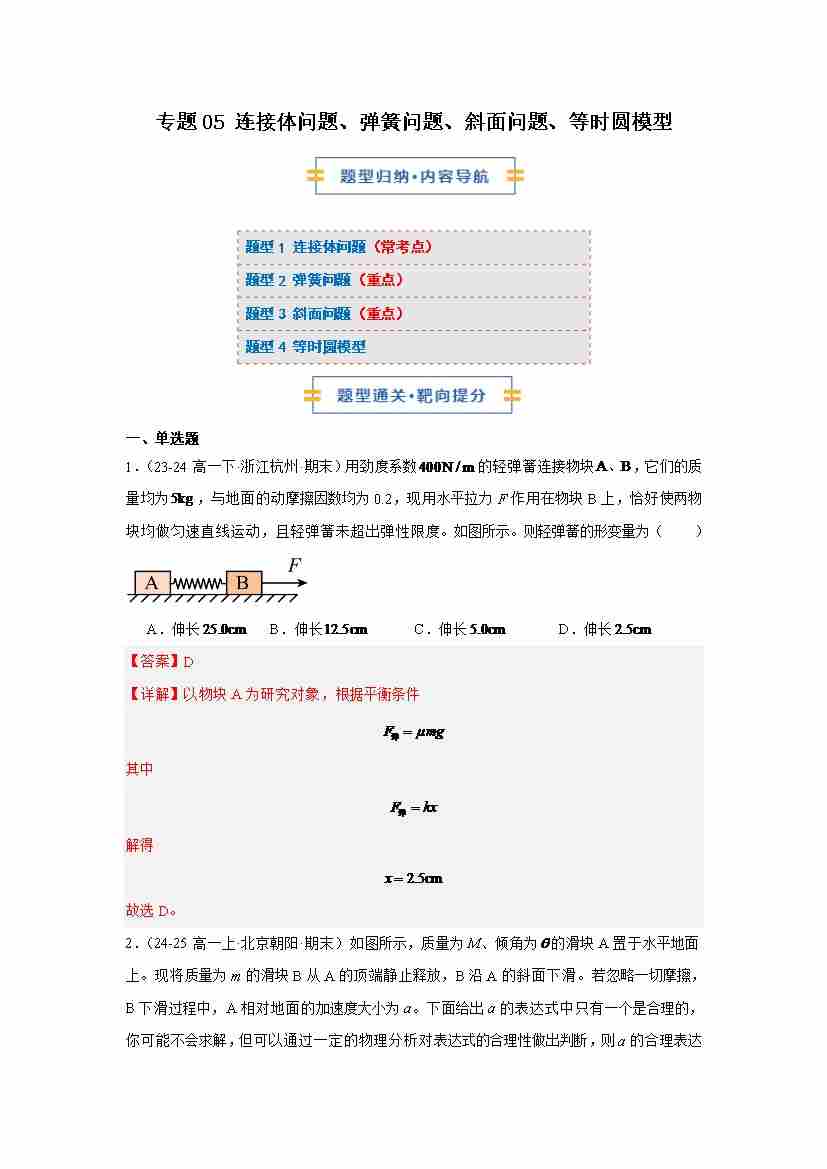 专题05 连接体问题、弹簧问题、斜面问题、等时圆模型(期末专项训练)(解析版)
