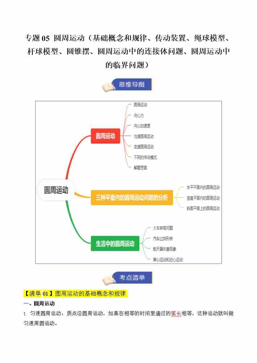 专题05 圆周运动(基础概念和规律、传动装置、绳球模型、杆球模型、圆锥摆、圆周运动中的连接体问题、圆周运动中的临界问题)(期末复习知识清单)(原卷版)