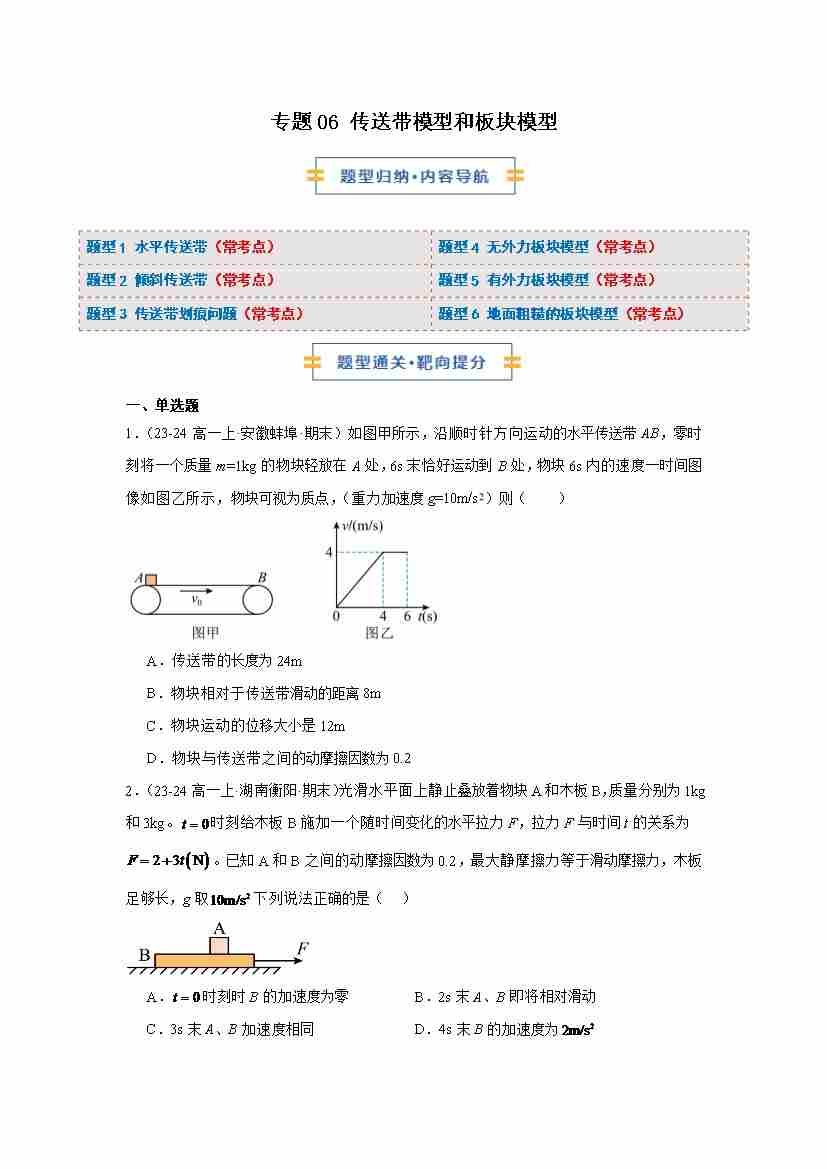 专题06 传送带模型和板块模型(期末专项训练)(原卷版)