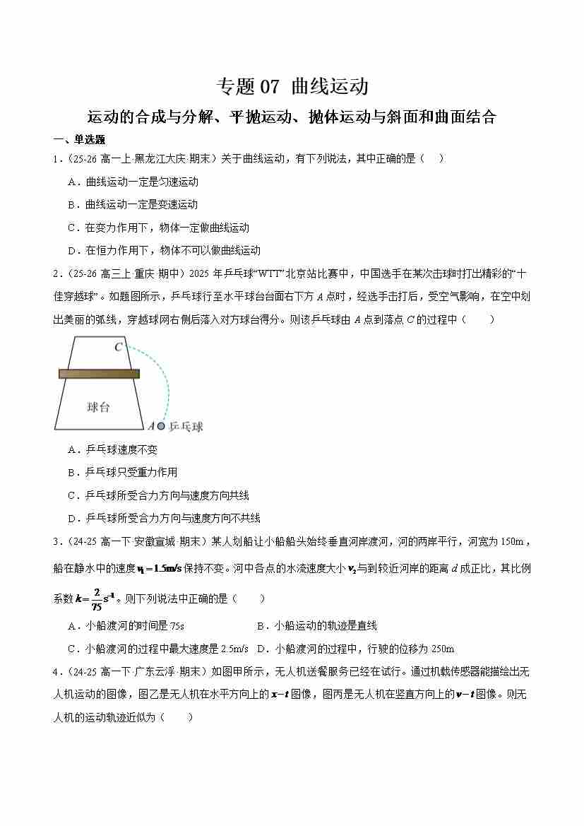 专题07 曲线运动(运动的合成与分解、平抛运动、抛体运动与斜面和曲面结合)(期末专项训练)(原卷版)