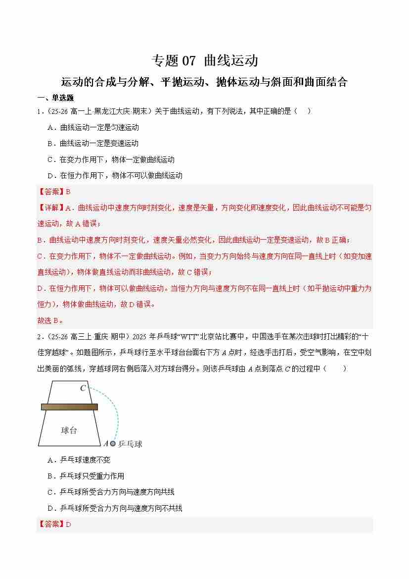 专题07 曲线运动(运动的合成与分解、平抛运动、抛体运动与斜面和曲面结合)(期末专项训练)(解析版)