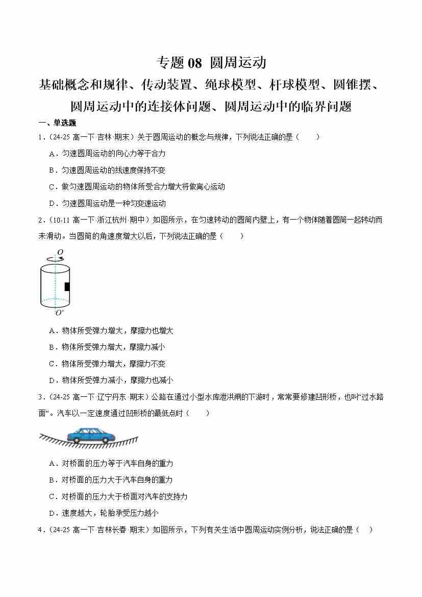 专题08 圆周运动(基础概念和规律、传动装置、绳球模型、杆球模型、圆锥摆、圆周运动中的连接体问题、圆周运动中的临界问题)(期末专项训练)(原卷版)
