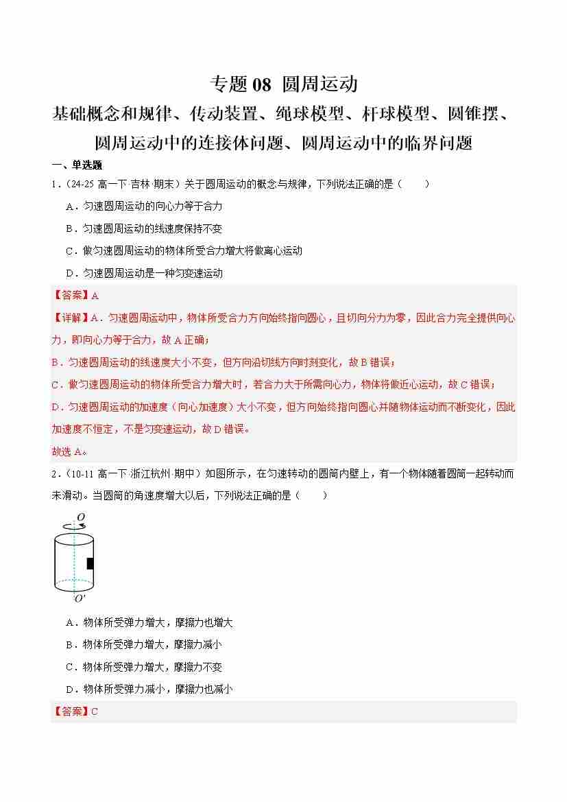 专题08 圆周运动(基础概念和规律、传动装置、绳球模型、杆球模型、圆锥摆、圆周运动中的连接体问题、圆周运动中的临界问题)(期末专项训练)(解析版)