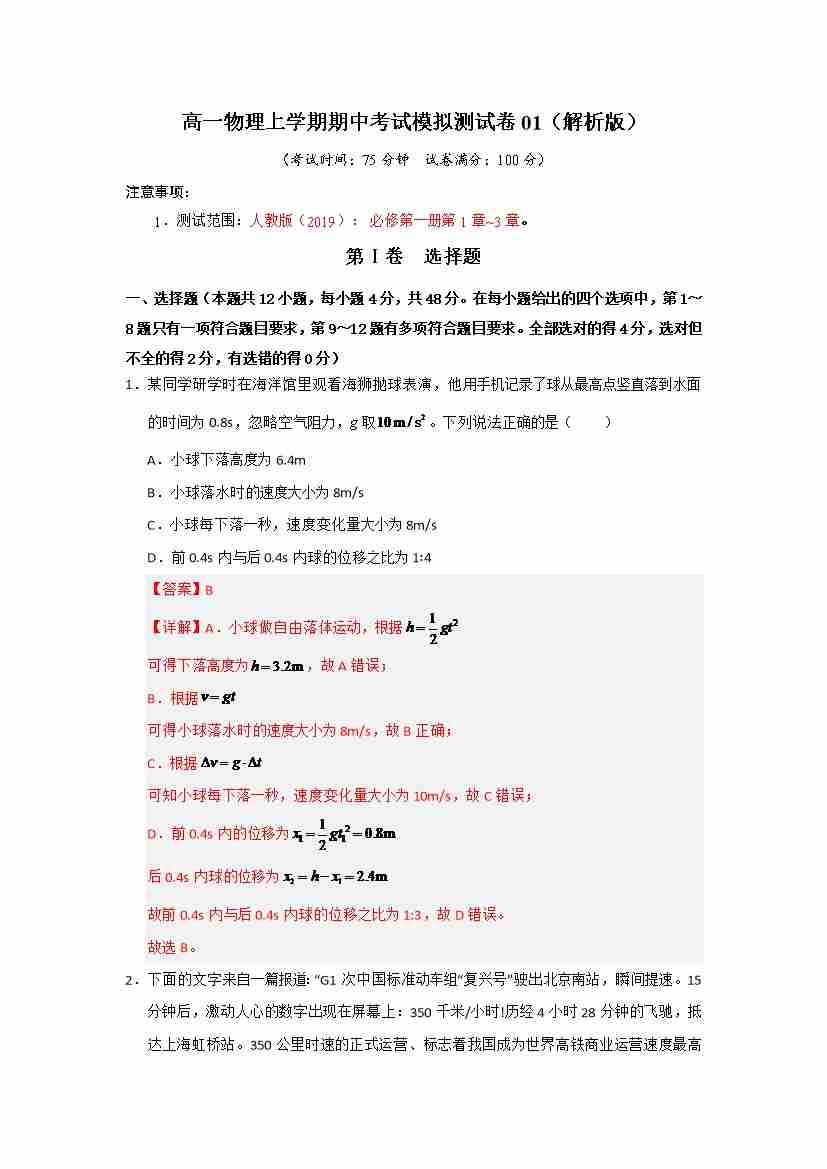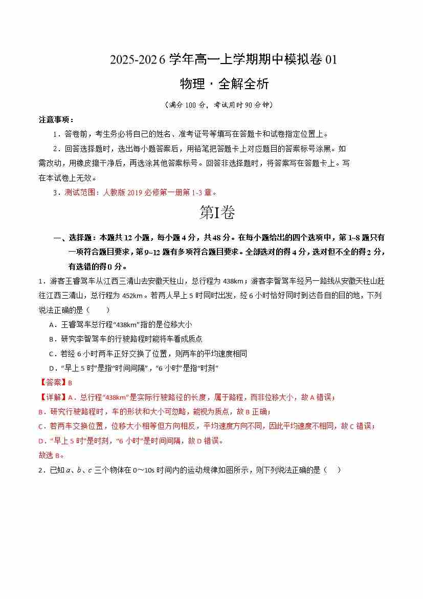 高一物理上学期期中模拟卷01(人教版2019)(全解全析)