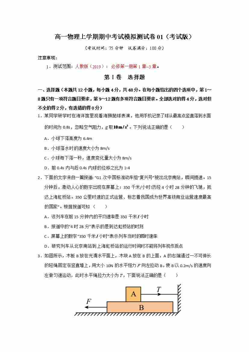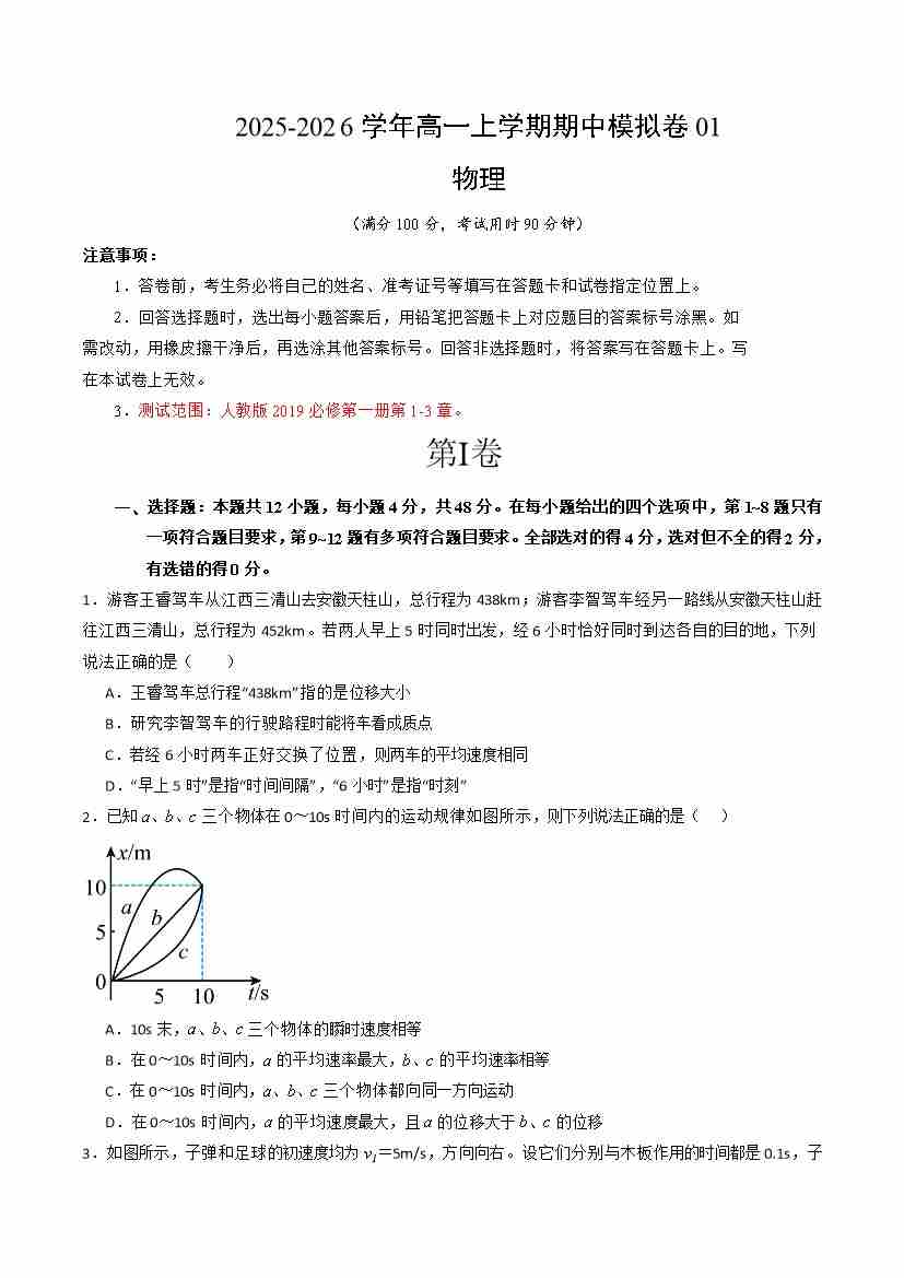 高一物理上学期期中考试模拟测试卷01(测试范围:人教版2019必修第一册,第1~3章)(考试版)