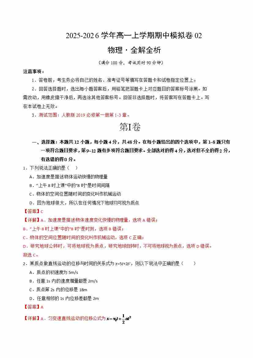 高一物理上学期期中模拟卷02(人教版2019)(全解全析)