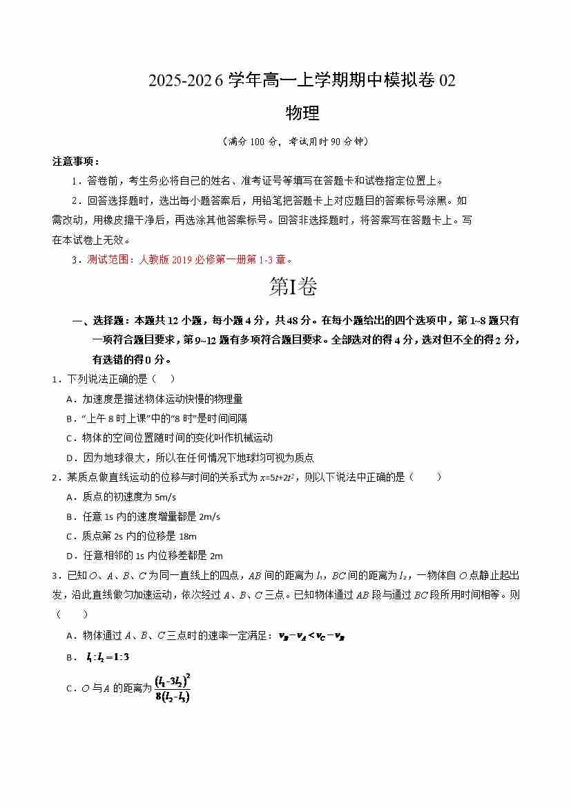 高一物理上学期期中模拟卷02(人教版2019)(考试版A4)