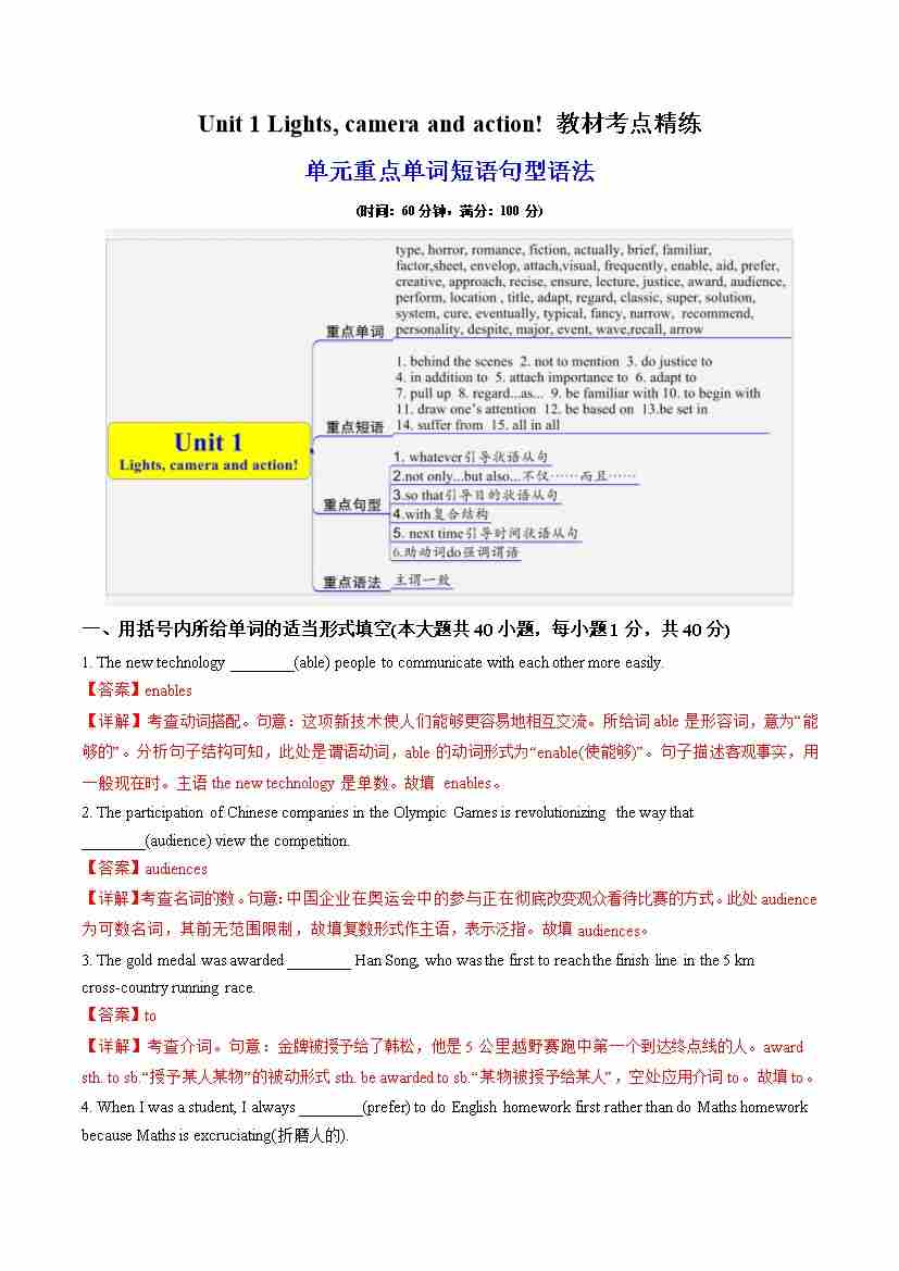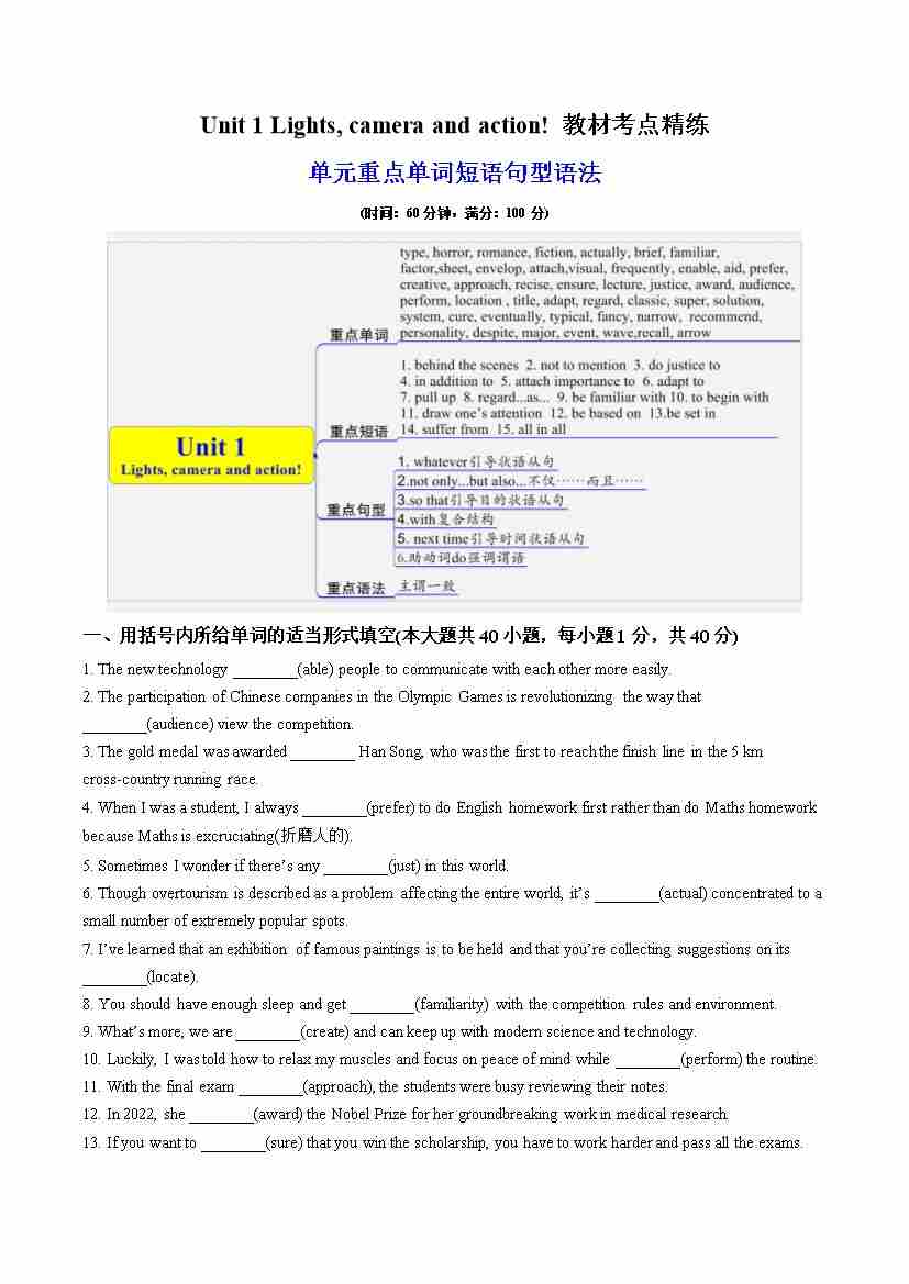 Unit 1 Lights, camera and action!单词短语句型语法(教材考点精练)(教师版)