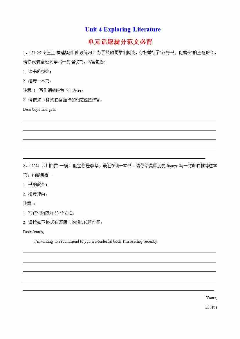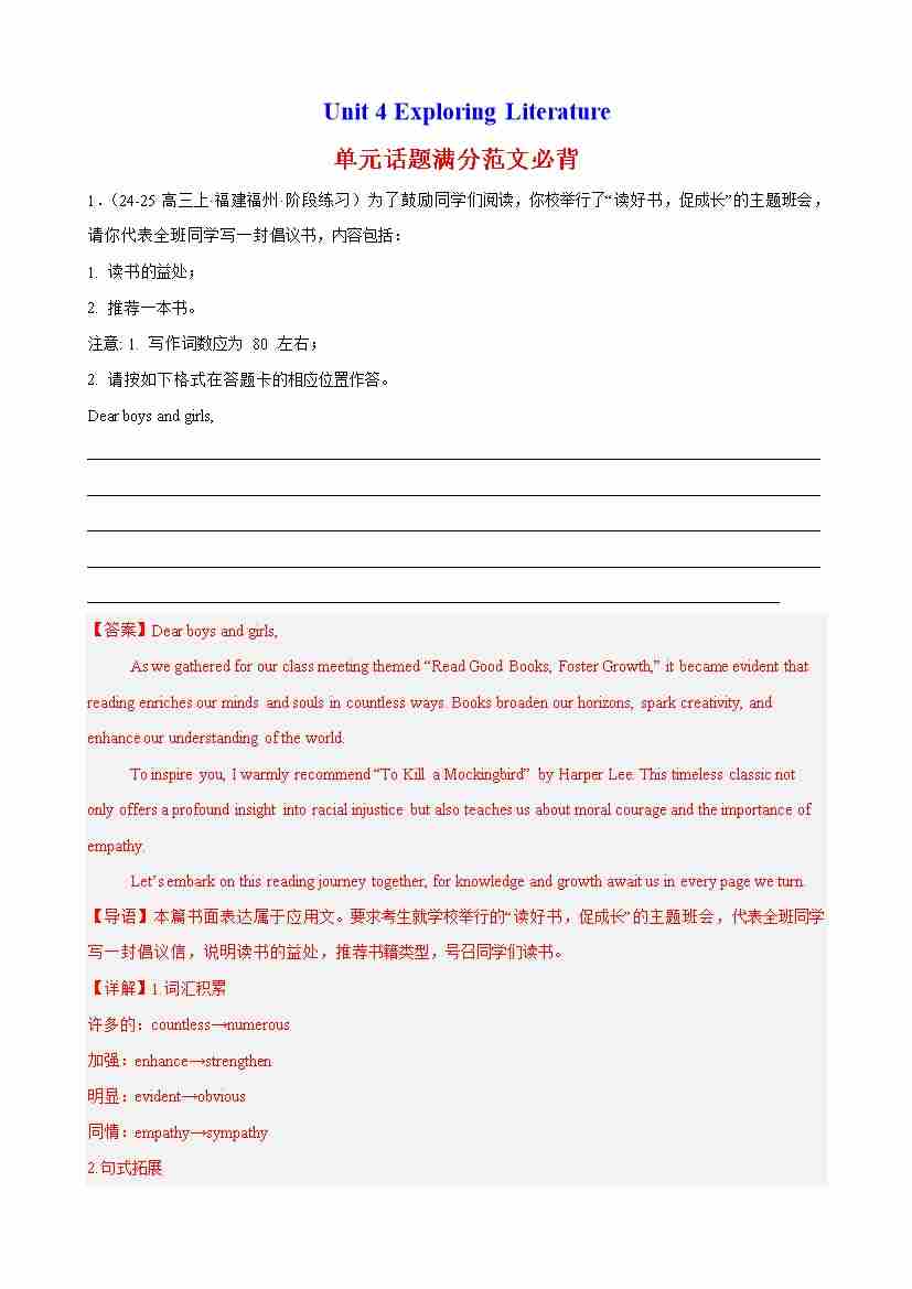 Unit 4 Exploring Literature 单元话题满分范文必背(学生版)