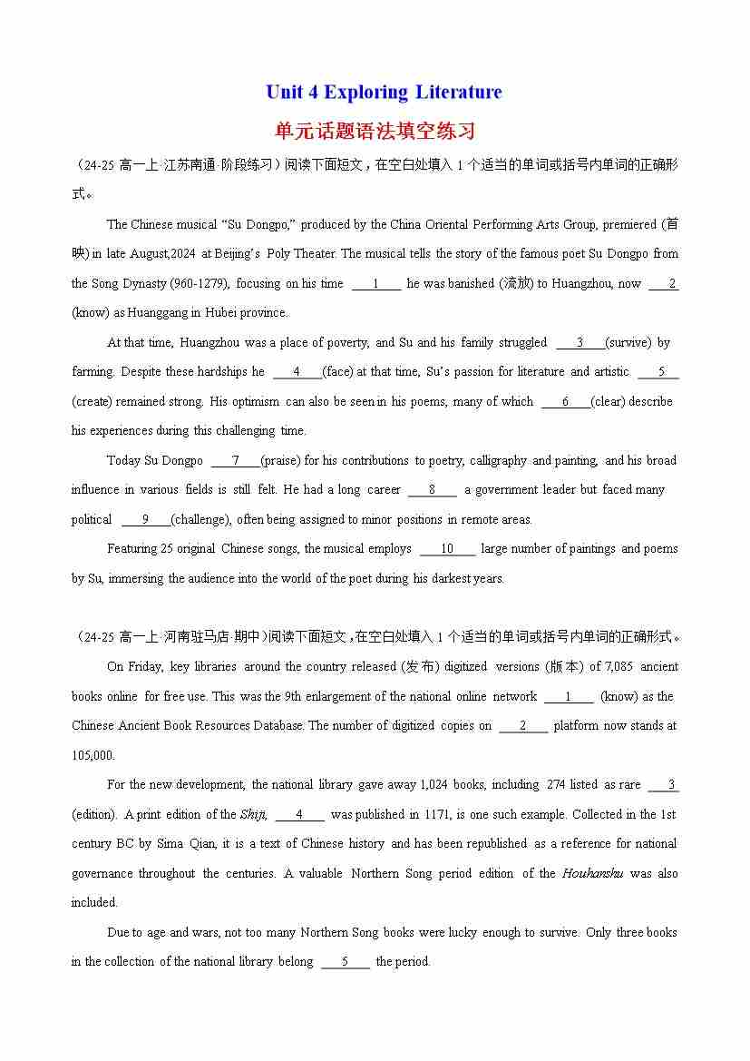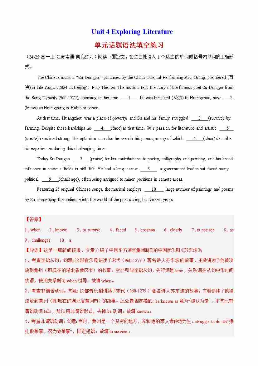 Unit 4 Exploring Literature 单元话题语法填空练习(学生版)