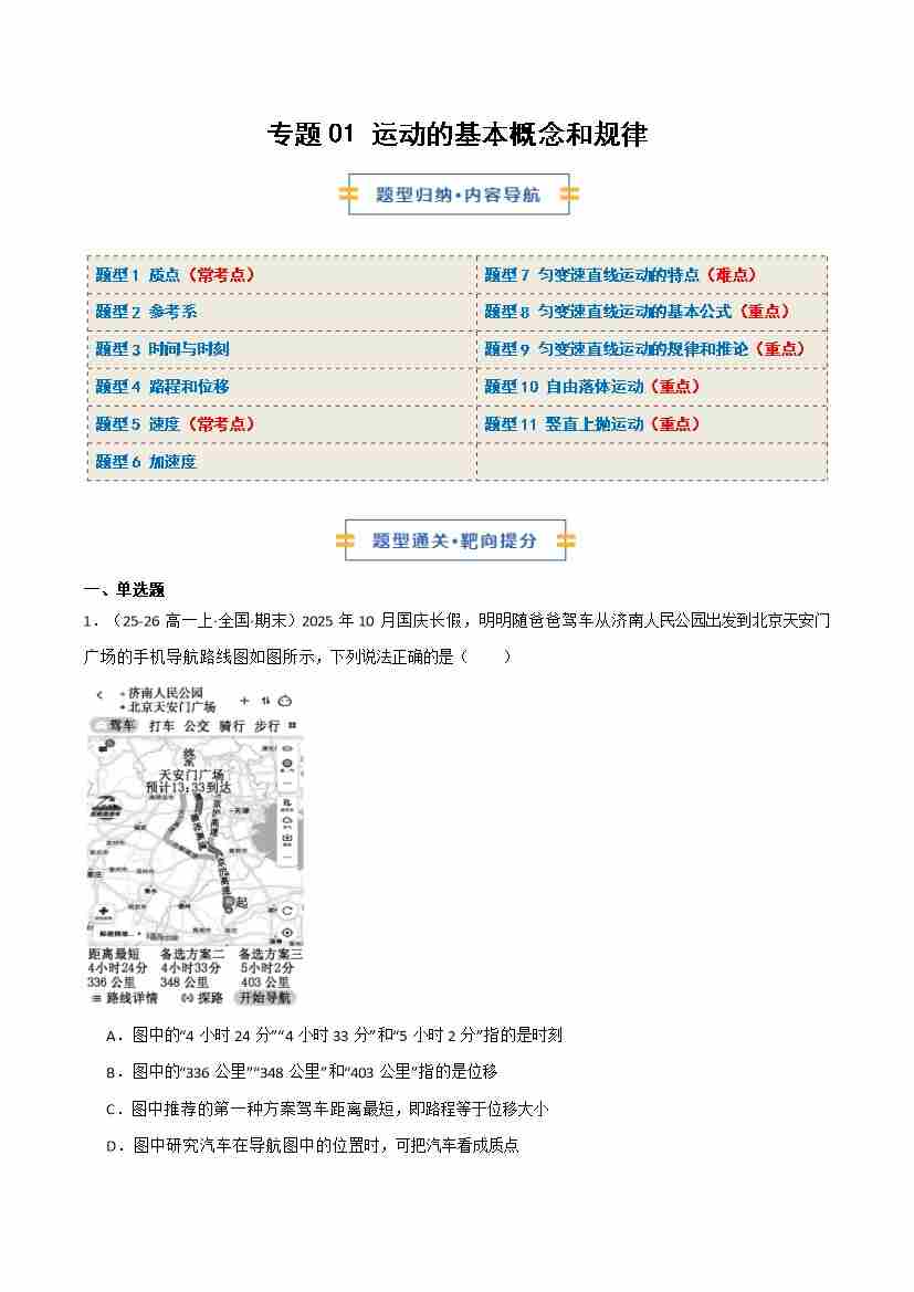专题01 运动的基本概念和规律(期末专项训练)(原卷版)