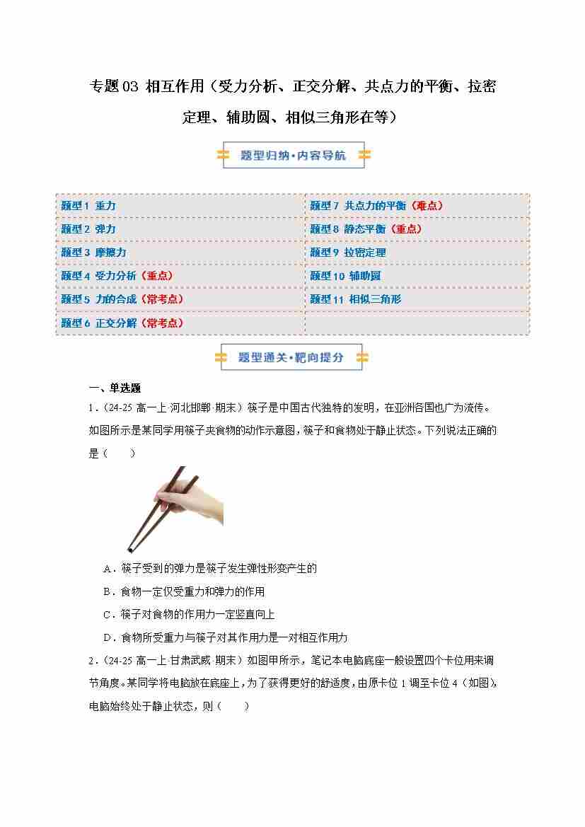 专题03 相互作用(受力分析、正交分解、共点力的平衡、拉密定理、辅助圆、相似三角形在等)(期末专项训练)(原卷版)