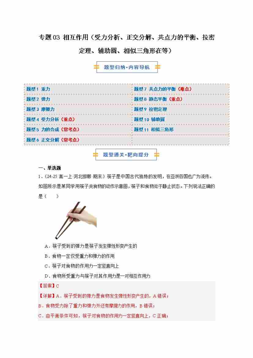 专题03 相互作用(受力分析、正交分解、共点力的平衡、拉密定理、辅助圆、相似三角形在等)(期末专项训练)(解析版)