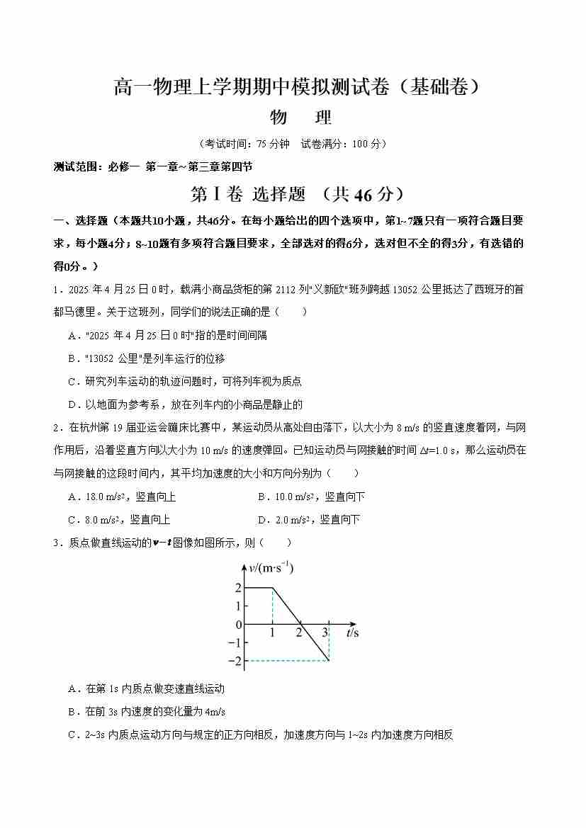 高一物理上学期期中模拟测试卷(基础卷)(学生版)