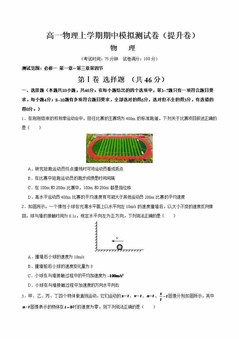 高一上物理第一章 单元测试·提升卷(考试版A4)