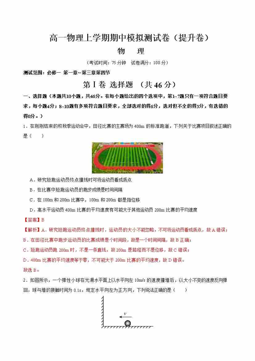 高一物理上学期期中模拟测试卷(提升卷)(教师版)