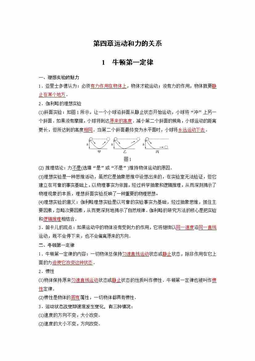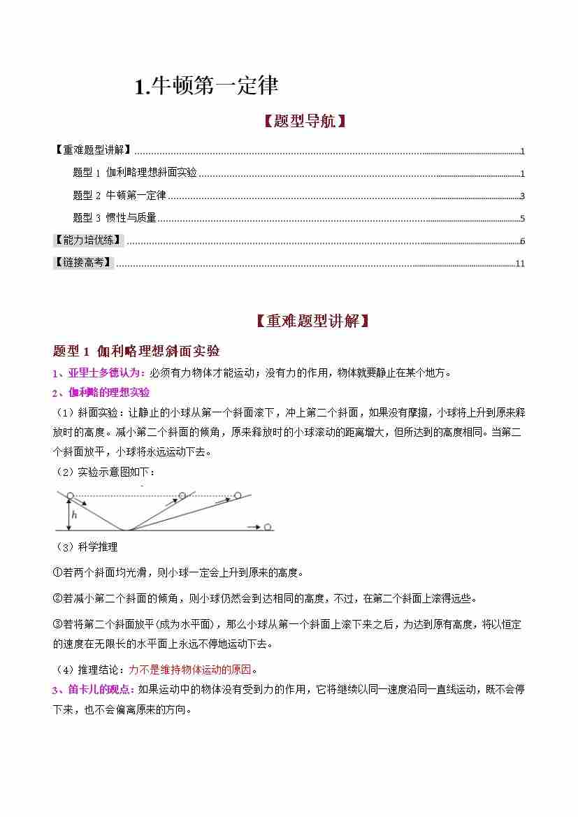 1.牛顿第一定律(高效培优讲义)(学生版)