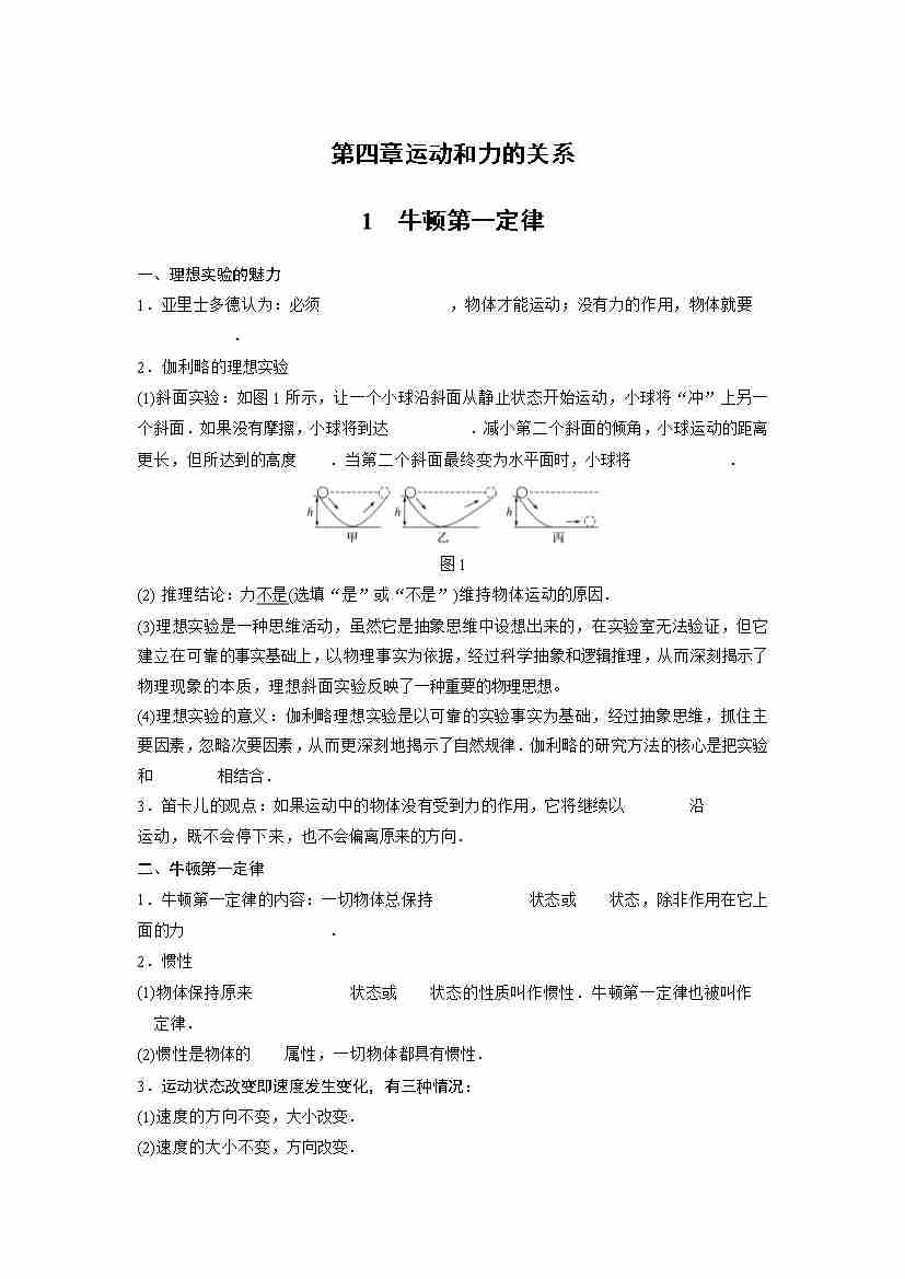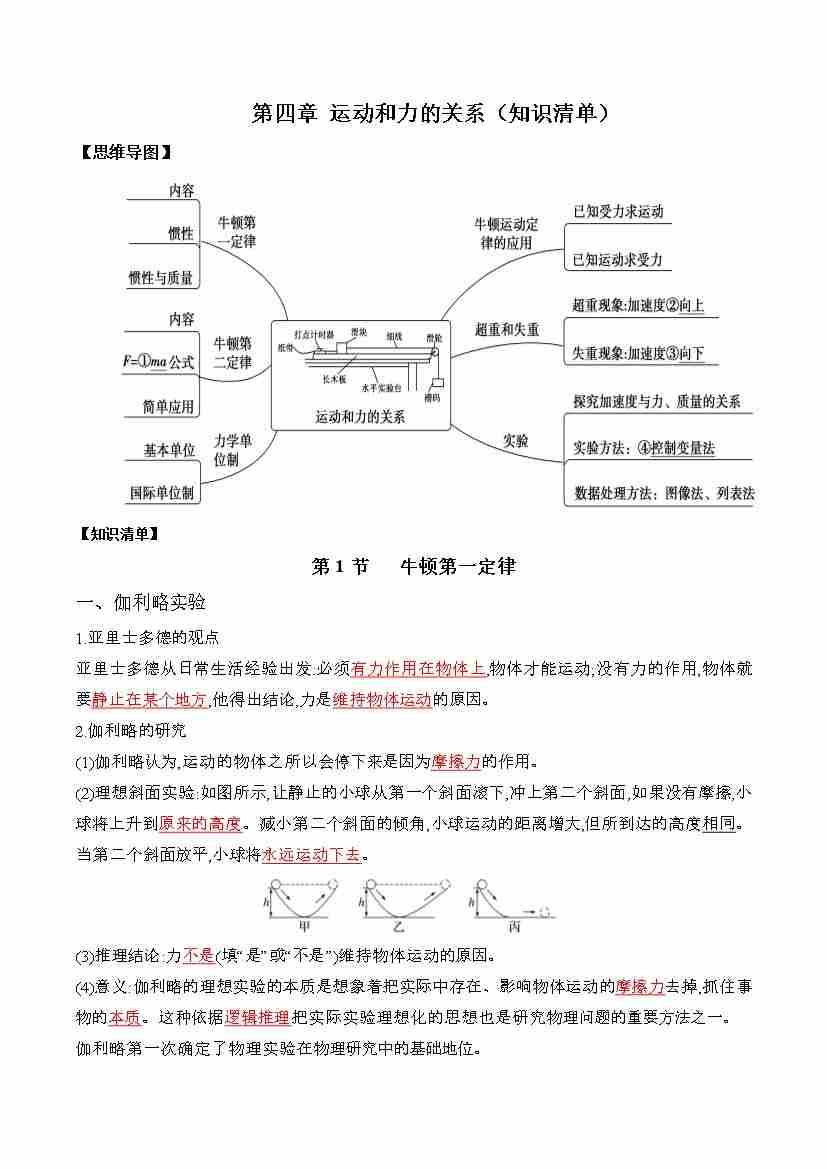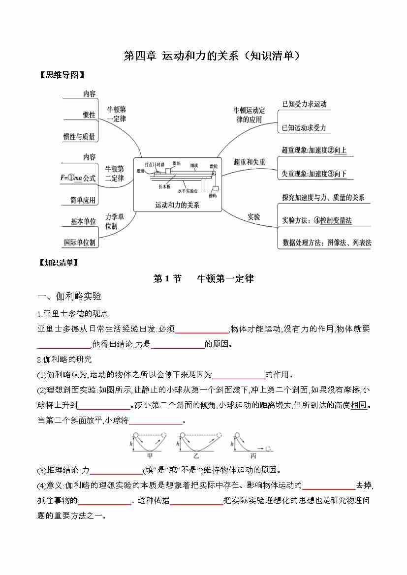 第四章 运动和力的关系(知识清单)(挖空板)