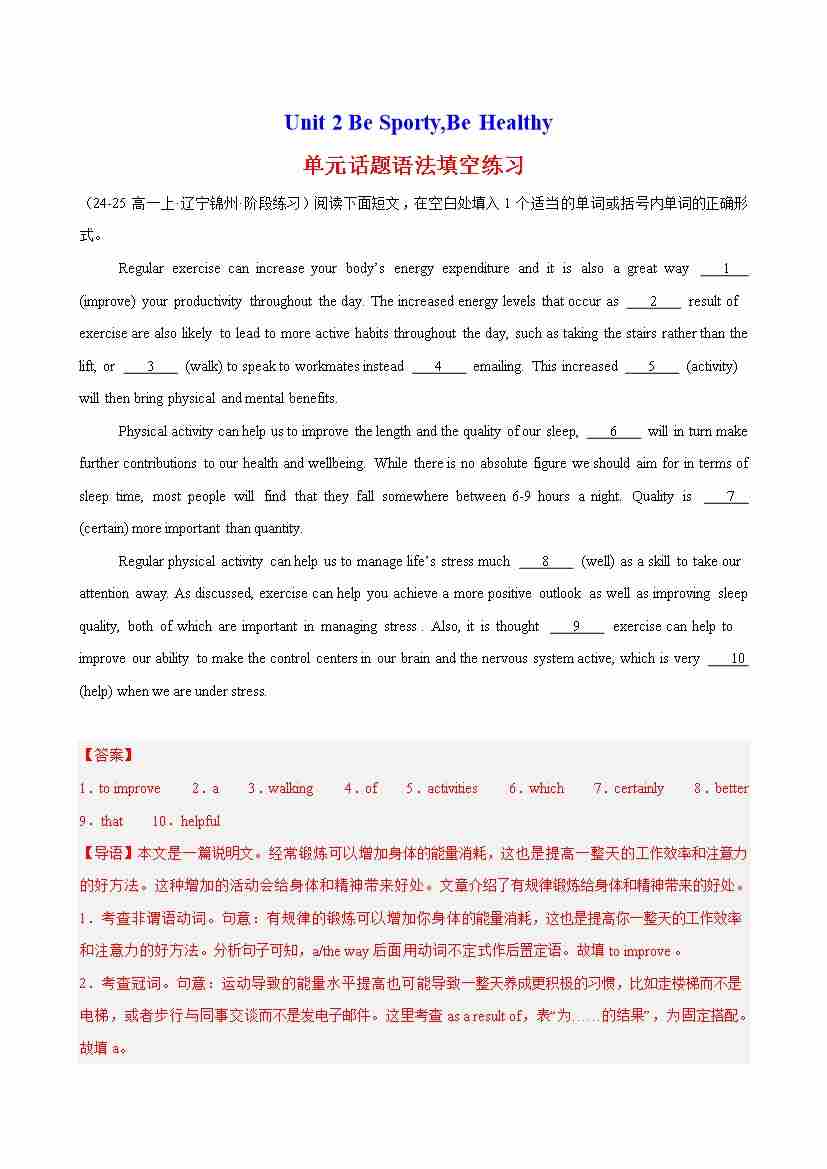 Unit 2 Be Sporty,Be Healthy 单元话题语法填空练习(教师版)