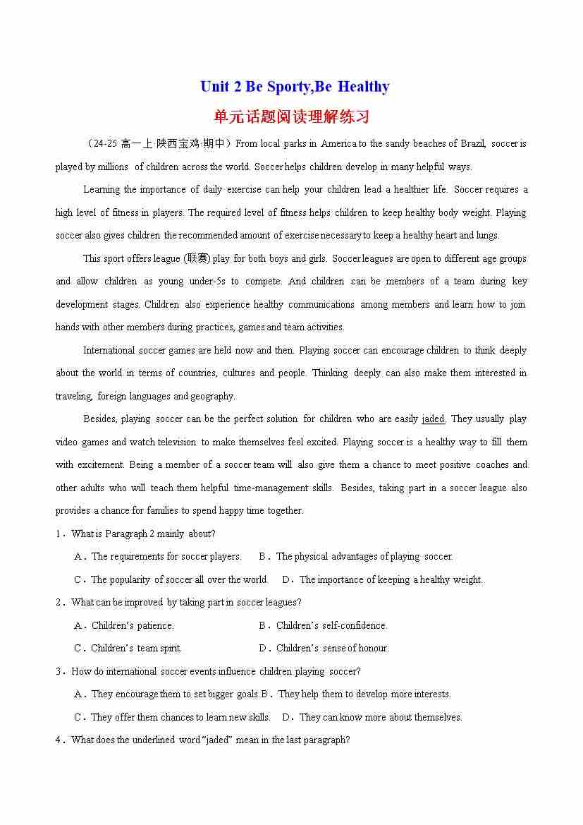 Unit 2 Be Sporty,Be Healthy 单元话题阅读理解练习(教师版)