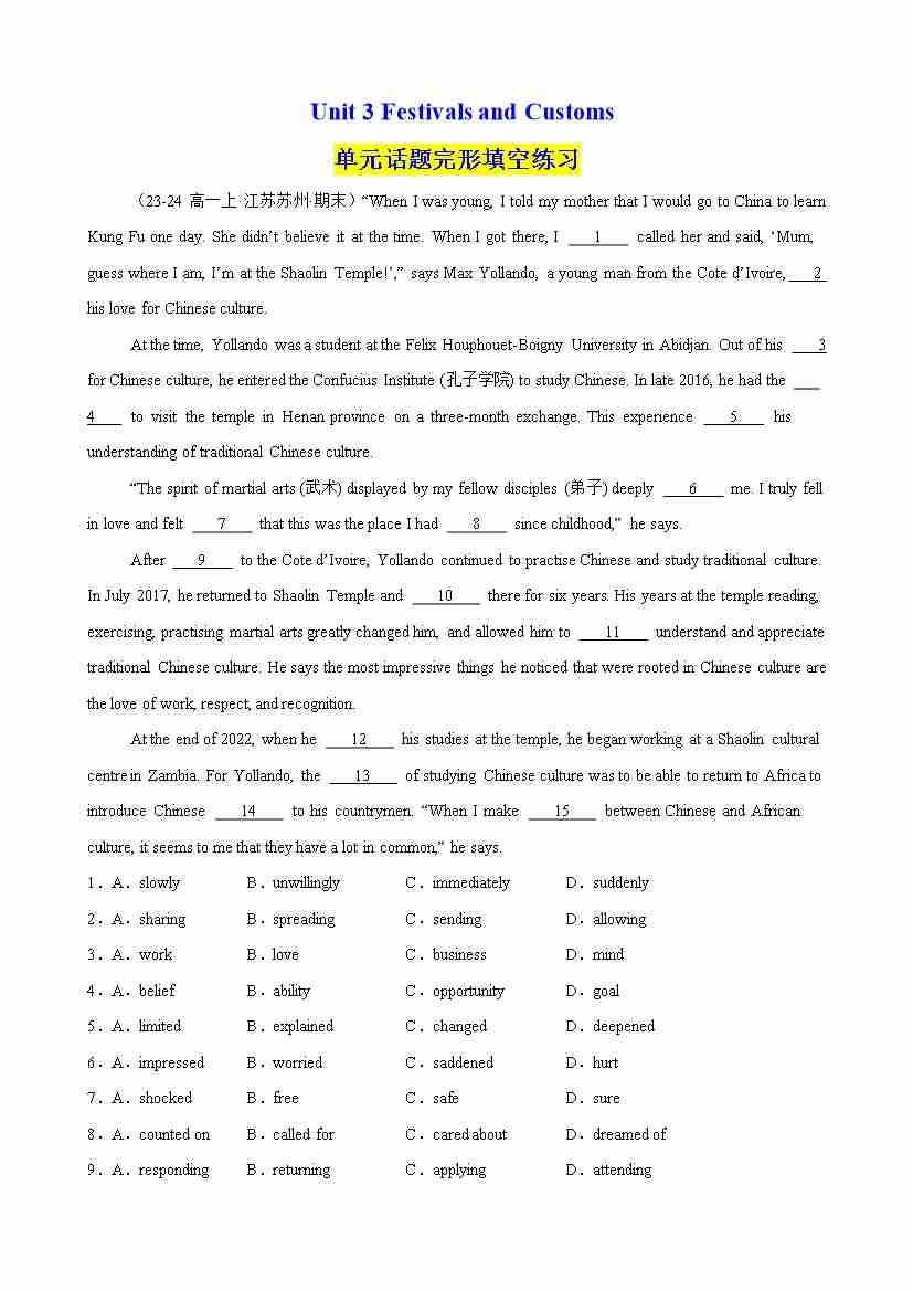 Unit 3 Festivals and Customs 单元话题完形填空练习(学生版)