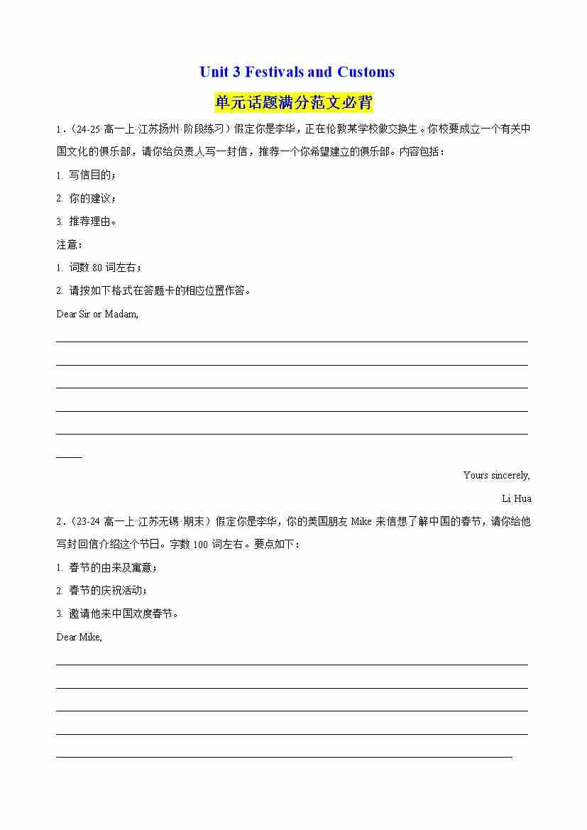 Unit 3 Festivals and Customs 单元话题满分范文必背(学生版)