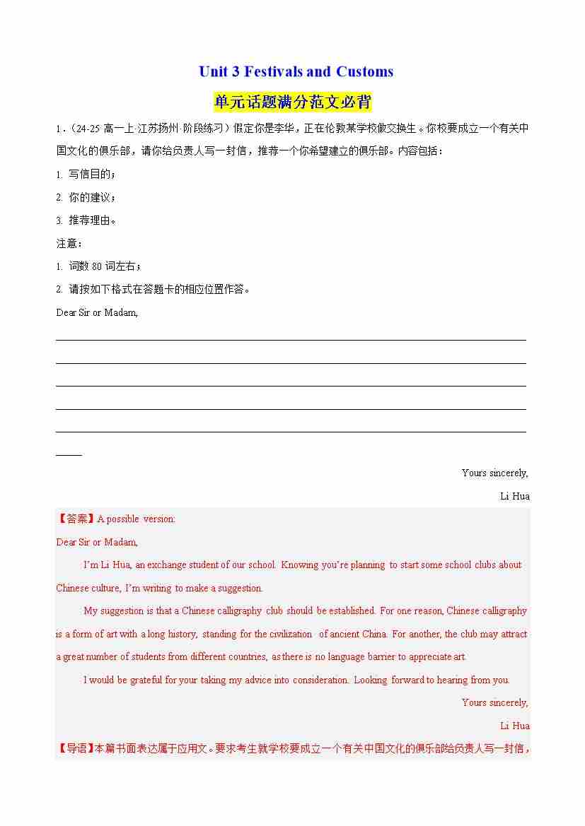 Unit 3 Festivals and Customs 单元话题满分范文必背(教师版)