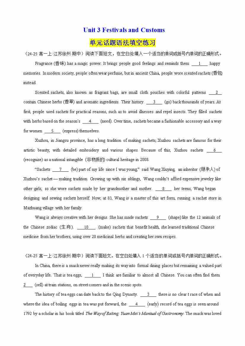 Unit 3 Festivals and Customs 单元话题语法填空练习(学生版)