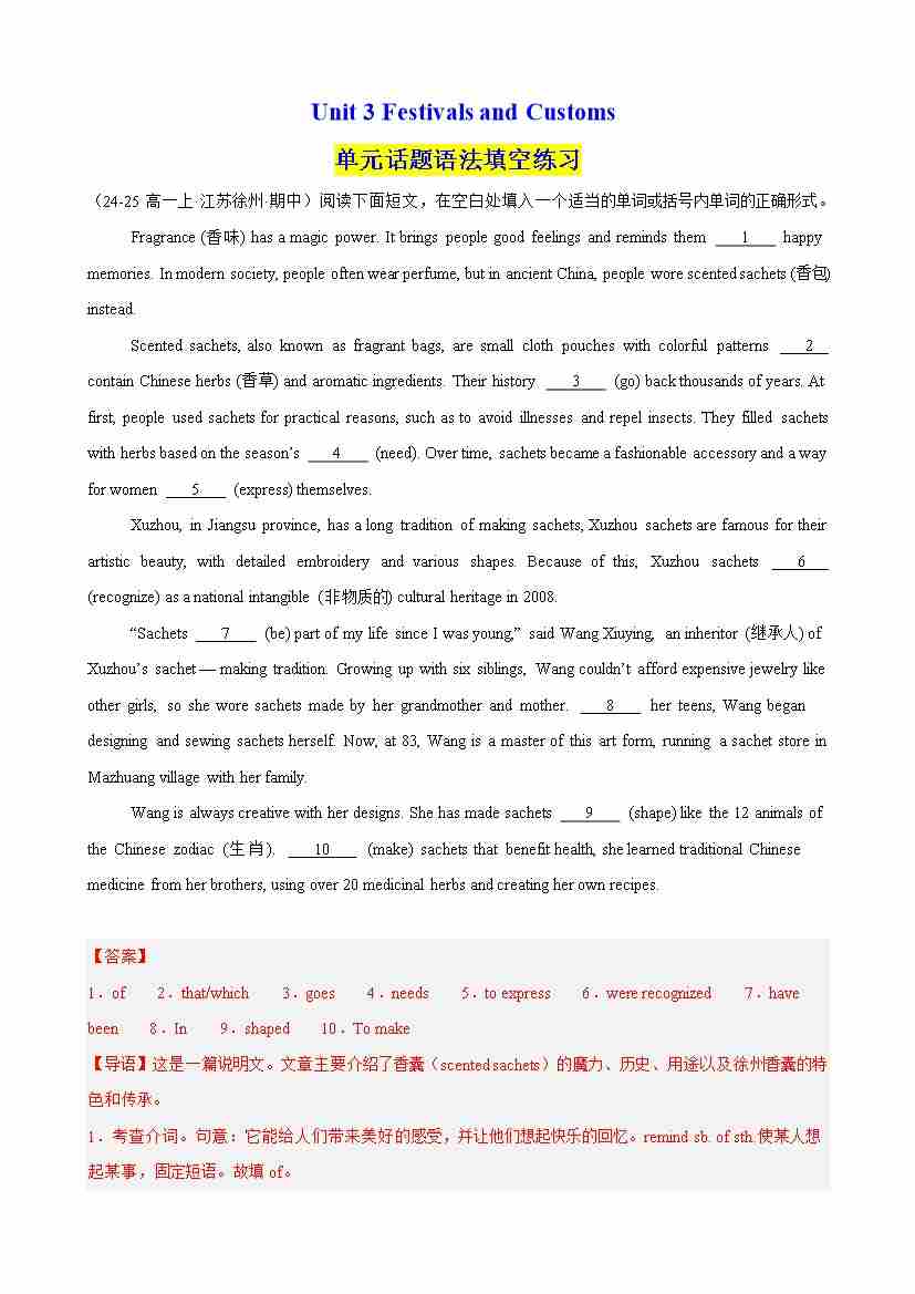 Unit 3 Festivals and Customs 单元话题语法填空练习(教师版)