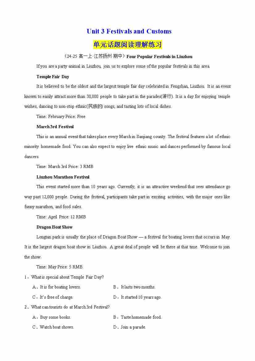 Unit 3 Festivals and Customs 单元话题阅读理解练习(学生版)