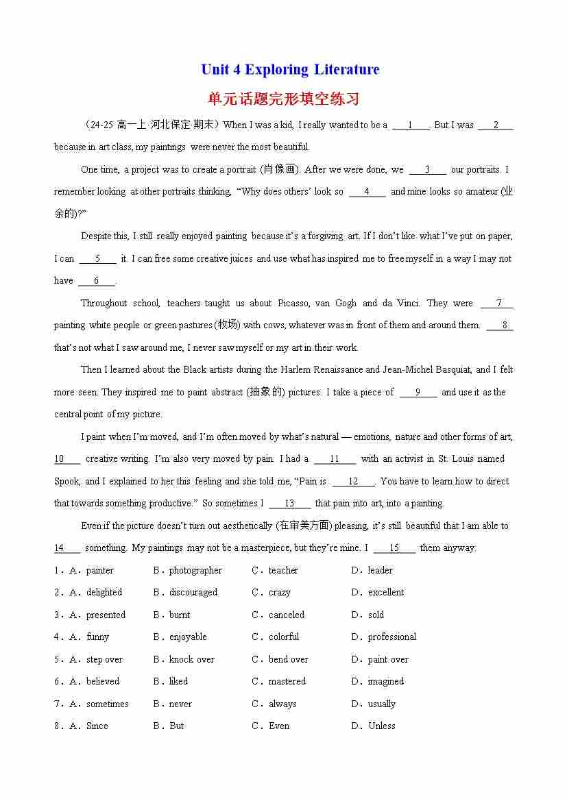 Unit 4 Exploring Literature 单元话题完形填空练习(教师版)