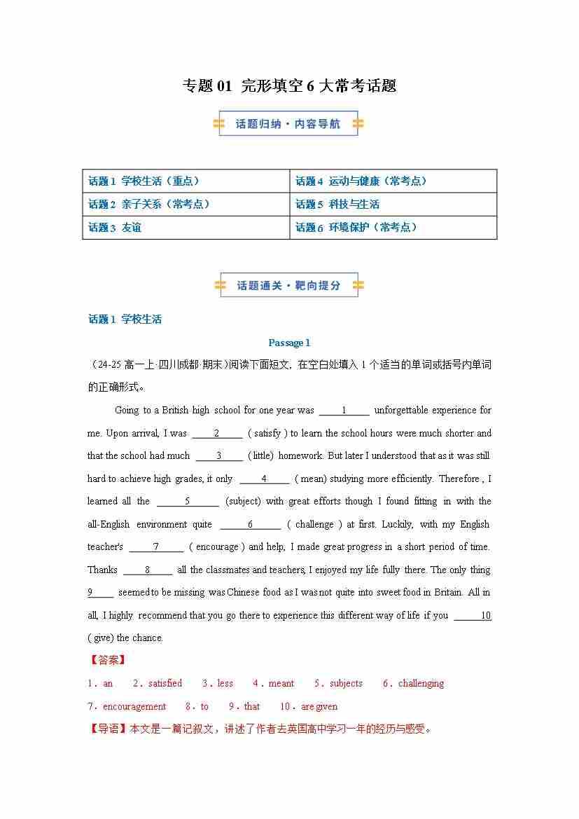 考前押题03 语法填空6大常考话题(期末复习专项训练)(解析版)