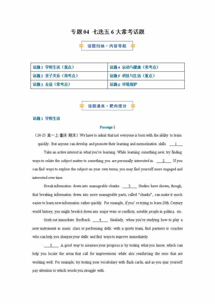 考前押题04 七选五6大常考话题(期末复习专项训练)(原卷版)