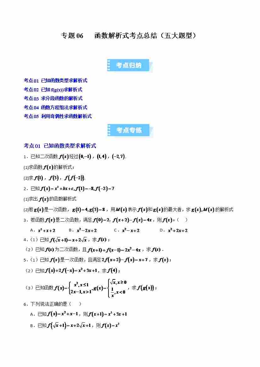 专题06 函数解析式考点总结(五大题型)(高效培优期中专项训练)(学生版)