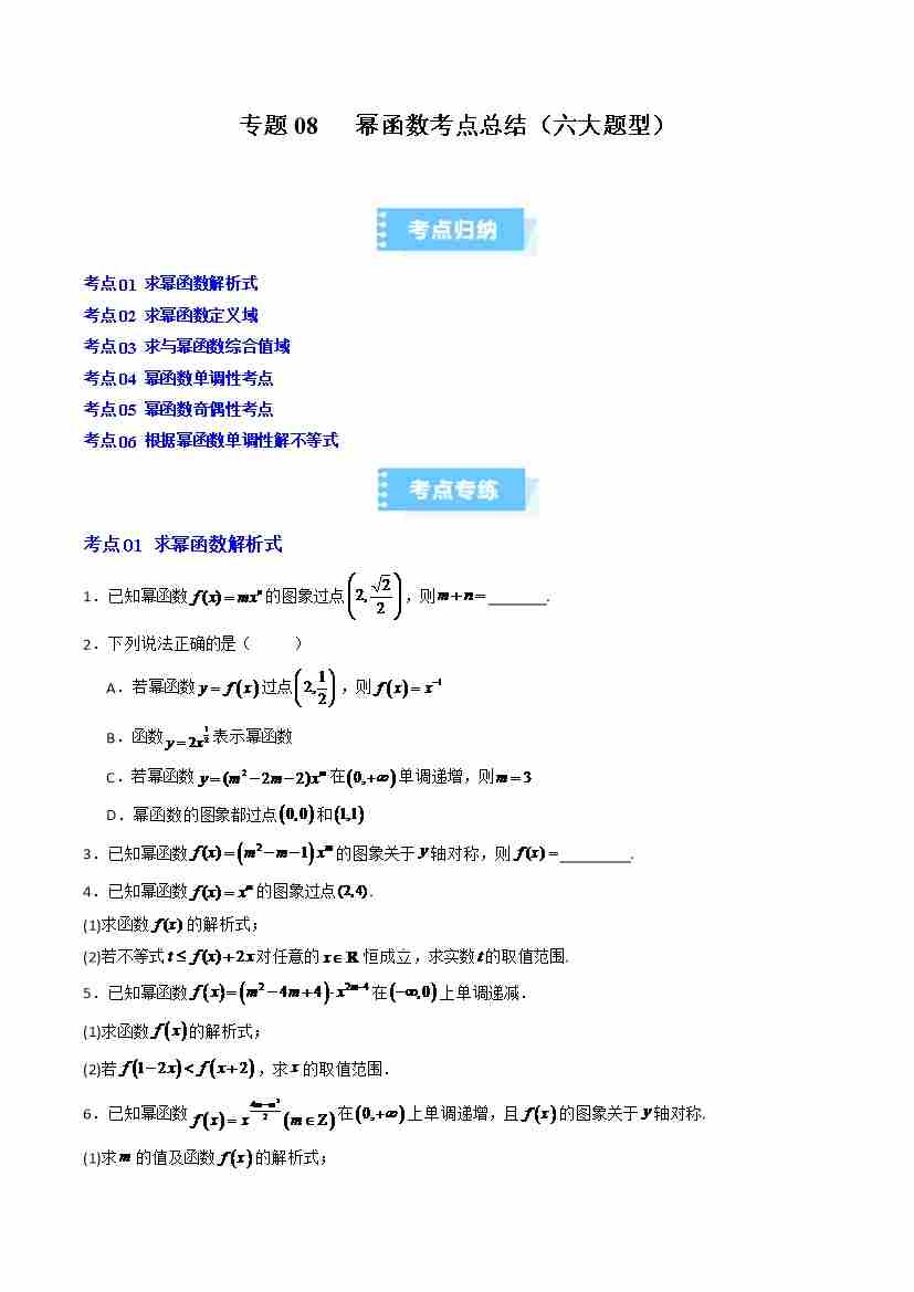 专题08 幂函数考点总结(六大题型)(高效培优期中专项训练)(学生版)