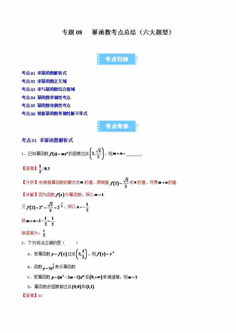 专题08 幂函数考点总结(六大题型)(高效培优期中专项训练)(教师版)