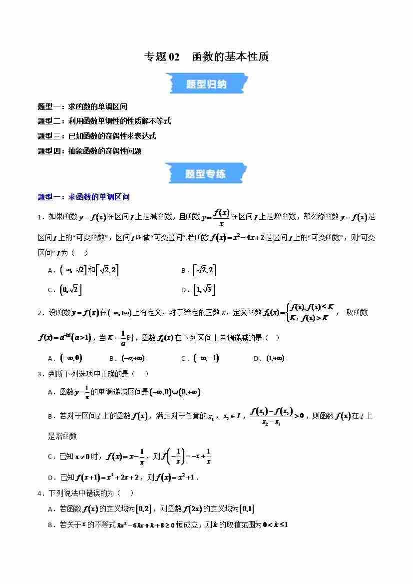 专题02 函数的基本性质的四大常考题型(高效培优专项训练)(学生版)
